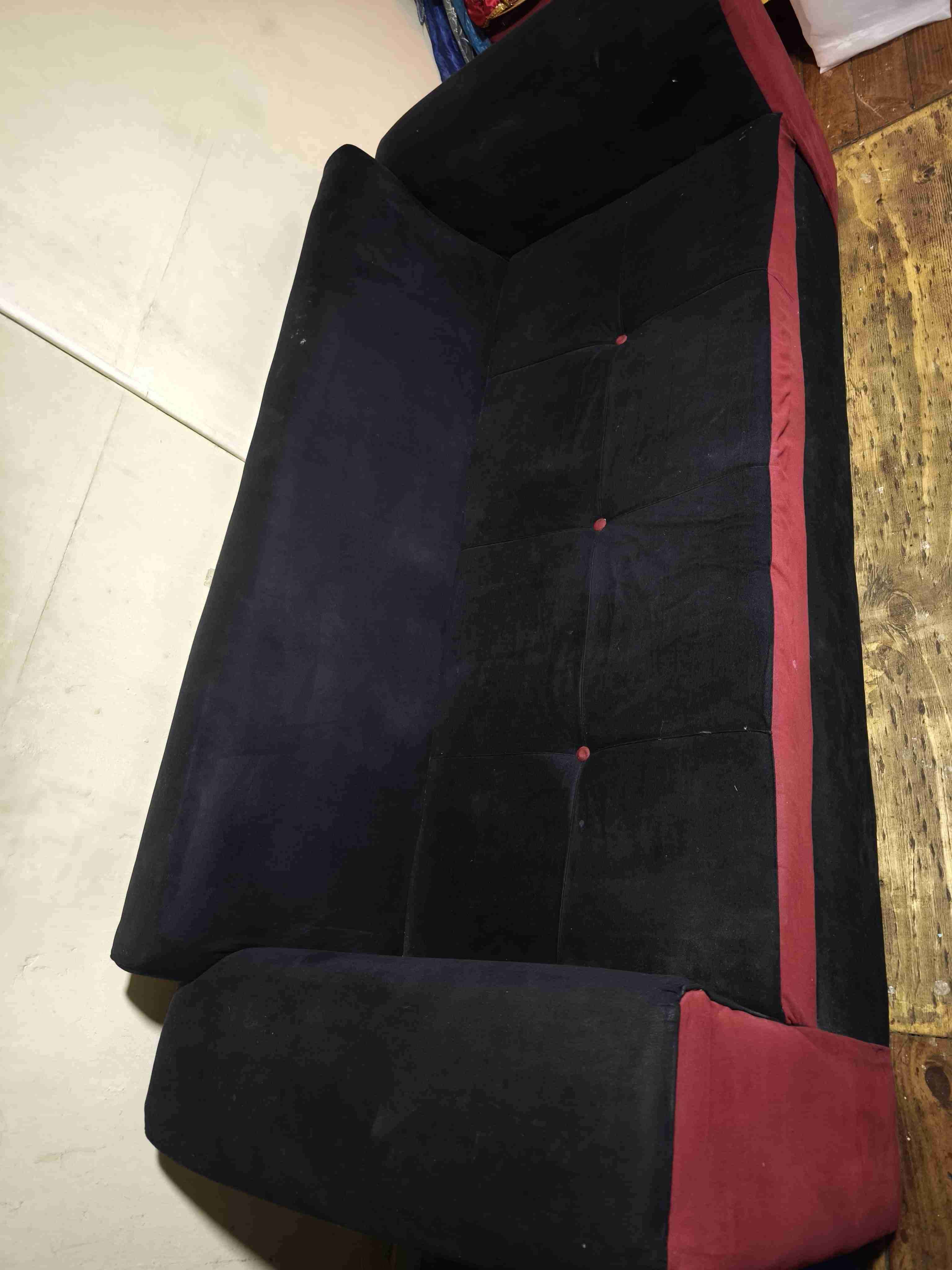 Cómodo sofá de dos plazas en color negro con detalles en rojo. Buen estado con leves signos de uso. Ideal para sala de estar.