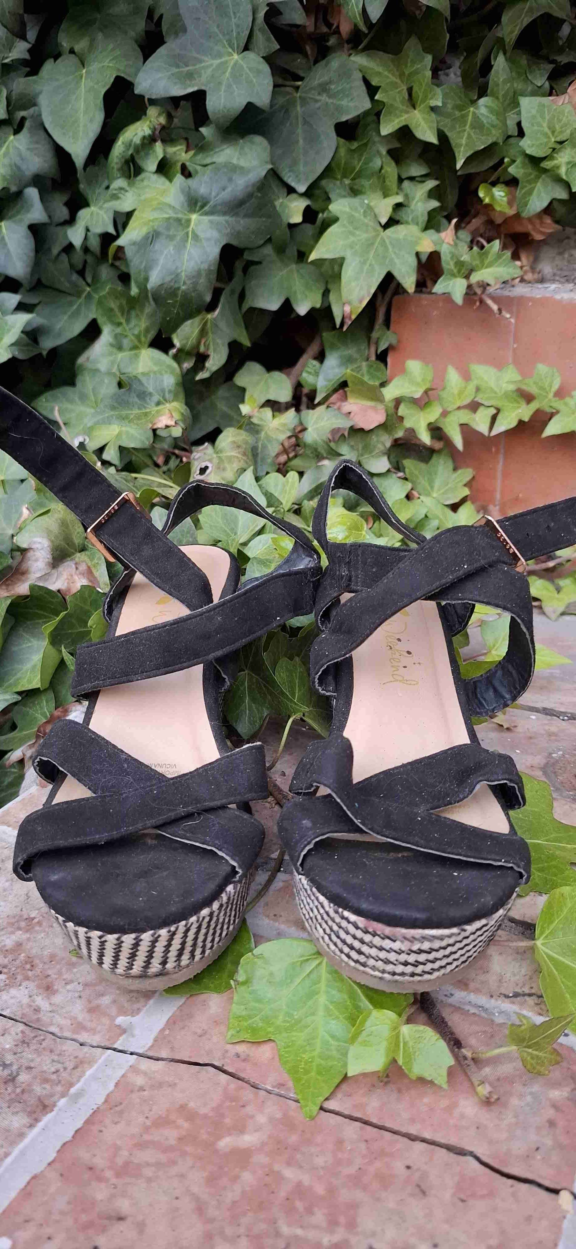 Sandalias negras con plataforma tejida, ideales para verano. En buen estado, con leve desgaste visible.