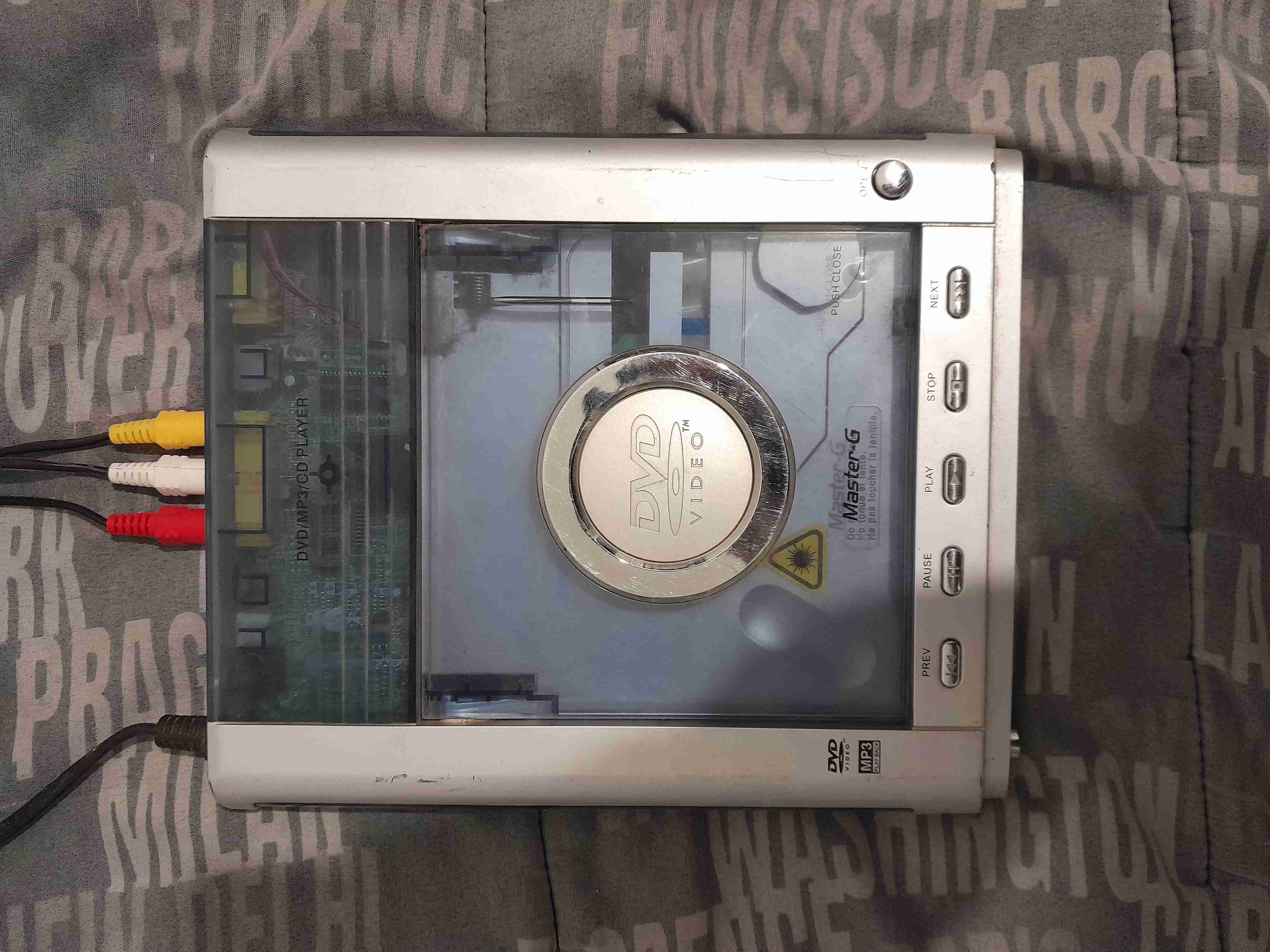 DVD Master-g, es pequeño, lee discos (DVD y CD) a la perfeccion, tiene sistema DOLBY DIGITAL, no incluye control remoto (porque no lo tengo), se envia con cables RCA, solo tiene uno que otro rayon por el paso de los años, todo lo demas perfecto.
