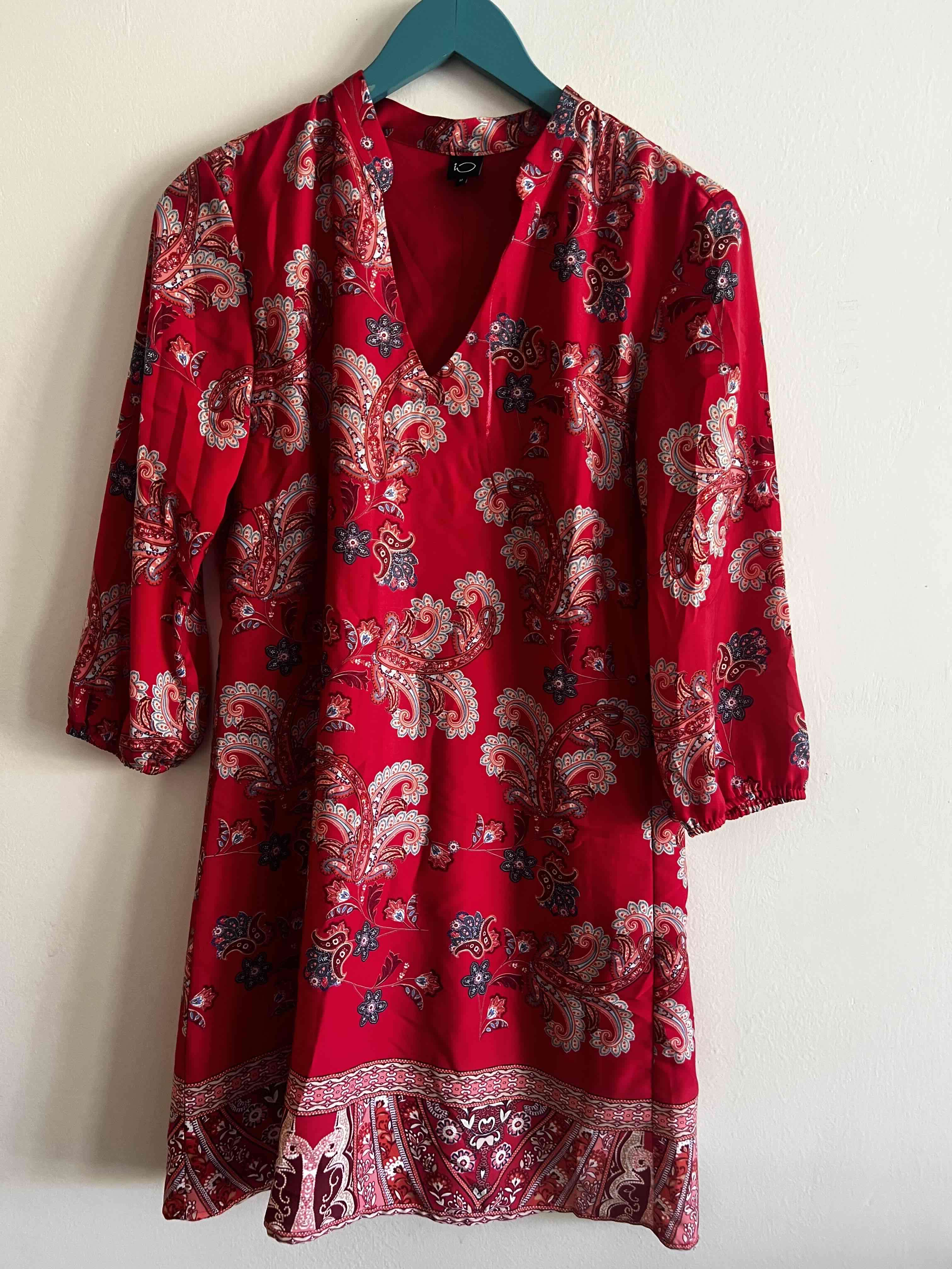 Vestido rojo suelto con un elegante estampado bohemio. Perfecto para el verano, en buen estado general.