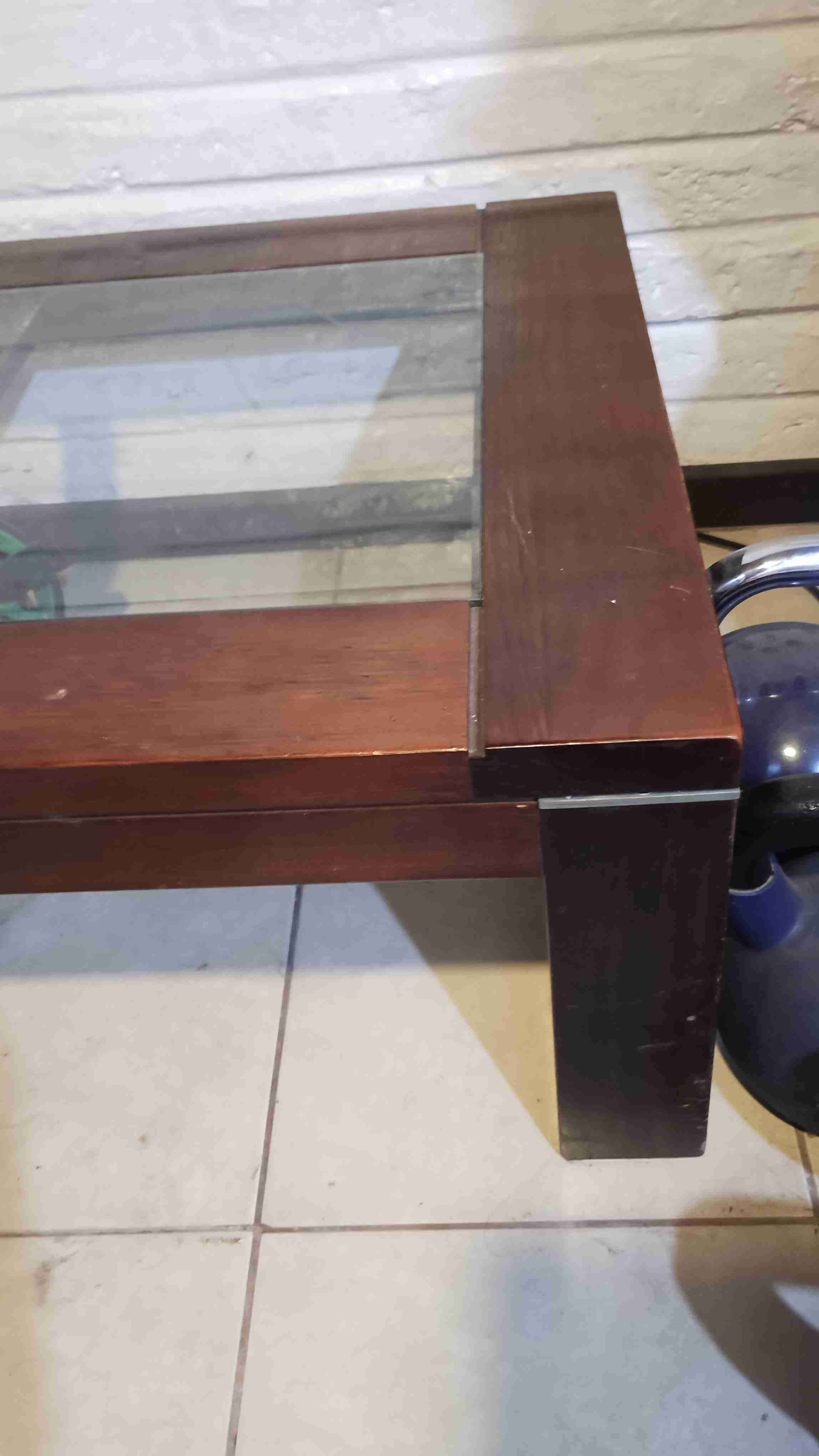 Elegante mesa de centro de madera oscura con superficie de vidrio. Ideal para el salón, en buen estado general. Medidas Largo 100 cm, ancho 70 CM y alto 35 cm