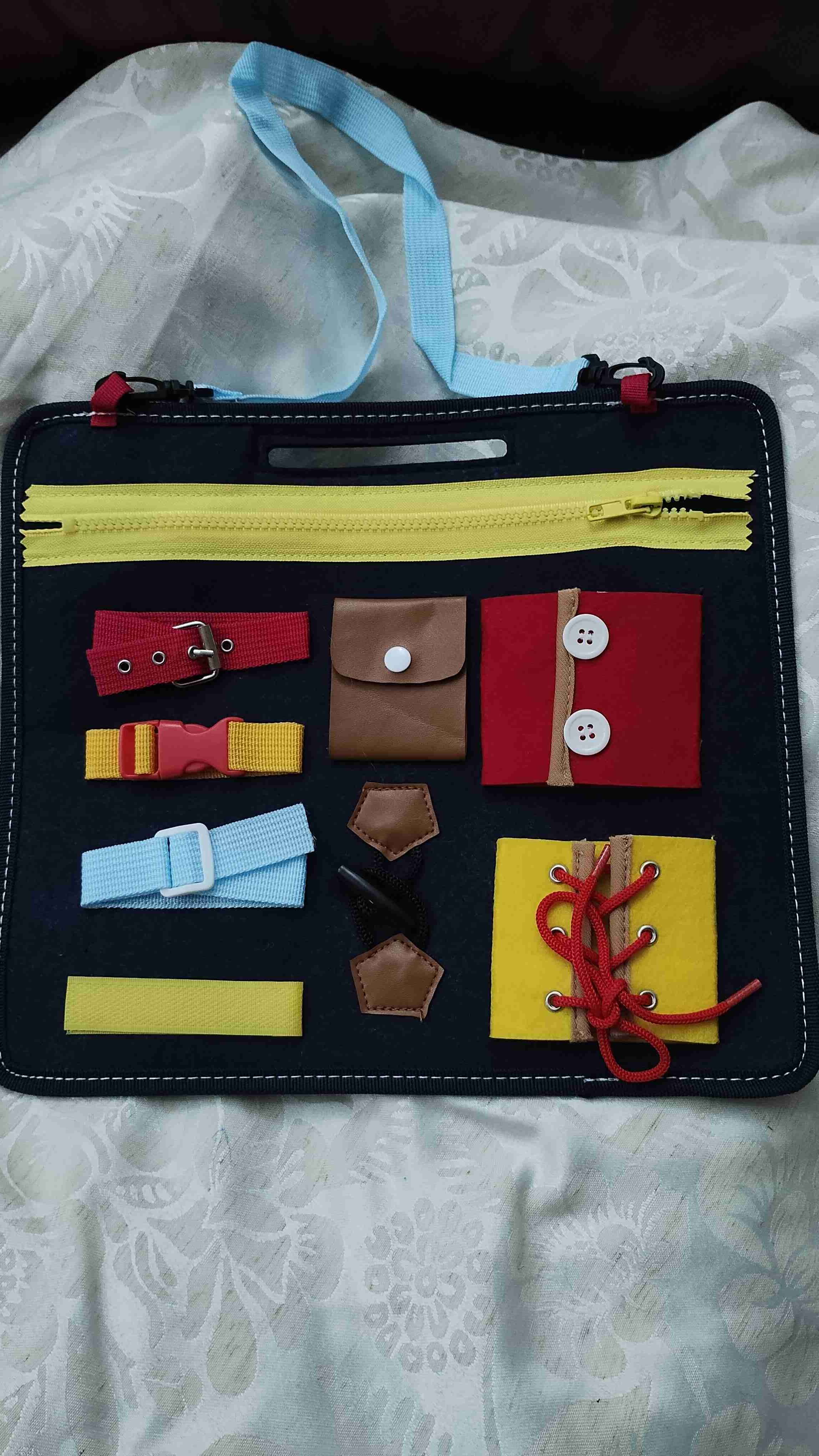 Ideal para desarrollar destrezas motoras finas en niños. Incluye varios tipos de cierres y hebillas coloridas. En buen estado.