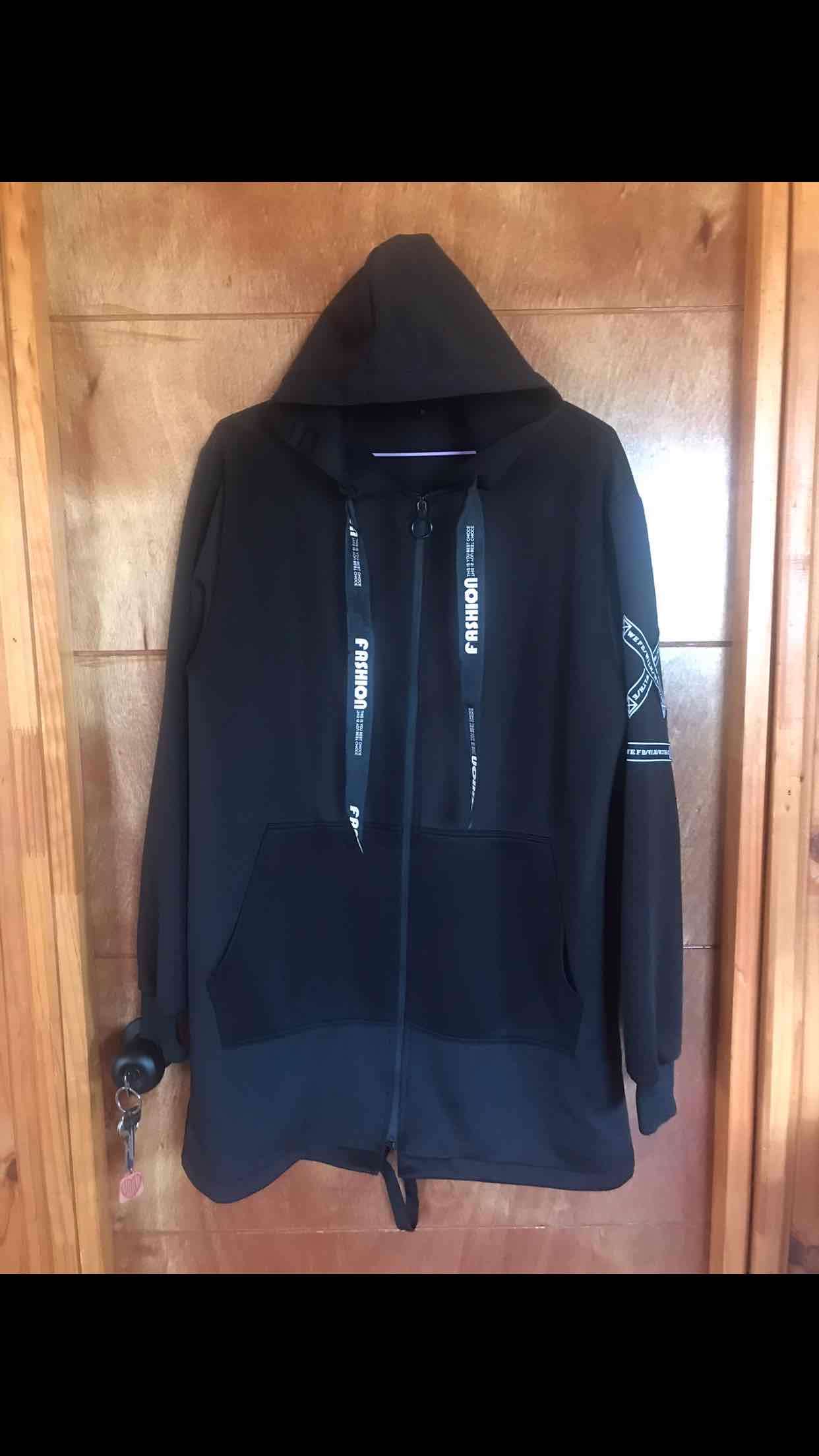 Cómodo polerón negro con capucha, ideal para días frescos. Detalles en las tiras y en la manga