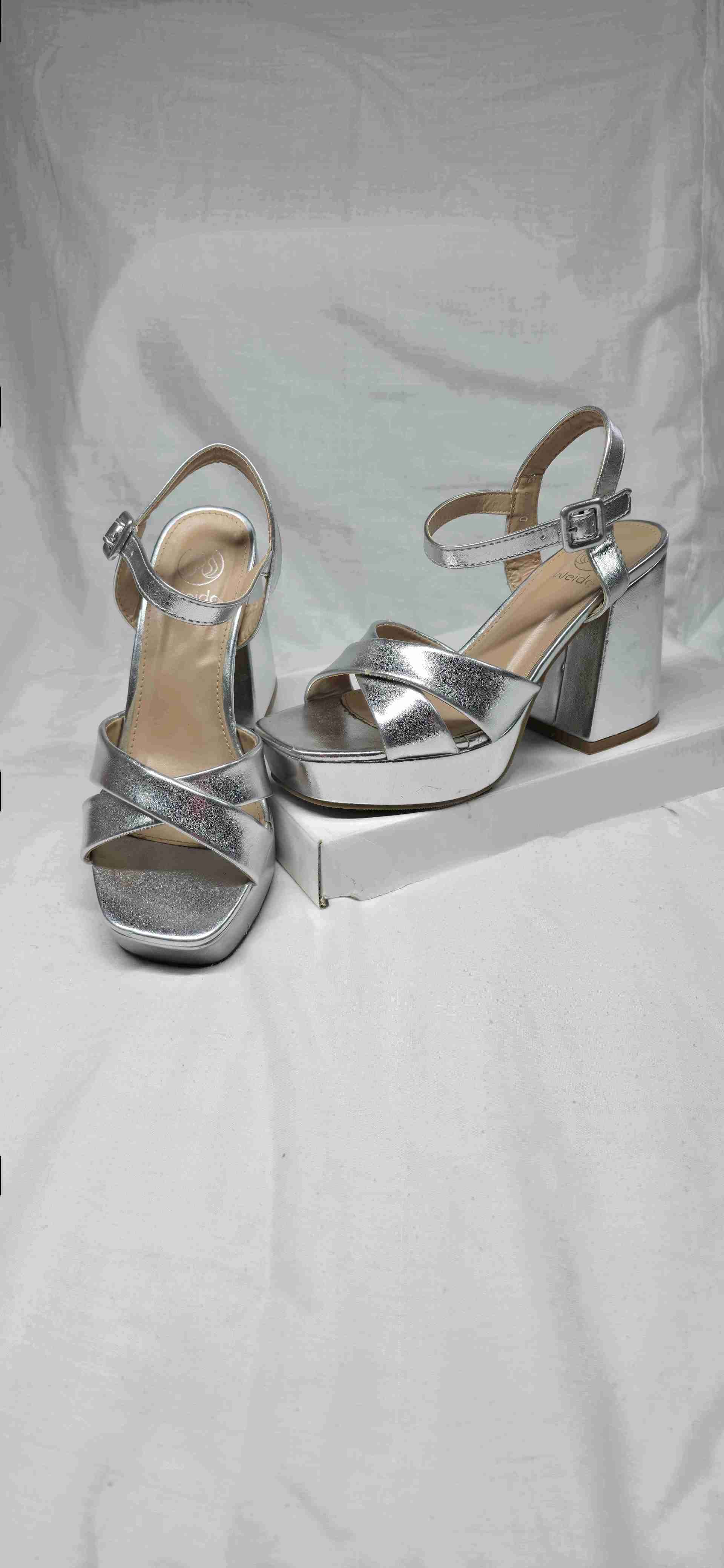 Elegantes sandalias plateadas con tacón grueso, perfectas para eventos formales. Excelente estado, como nuevas.