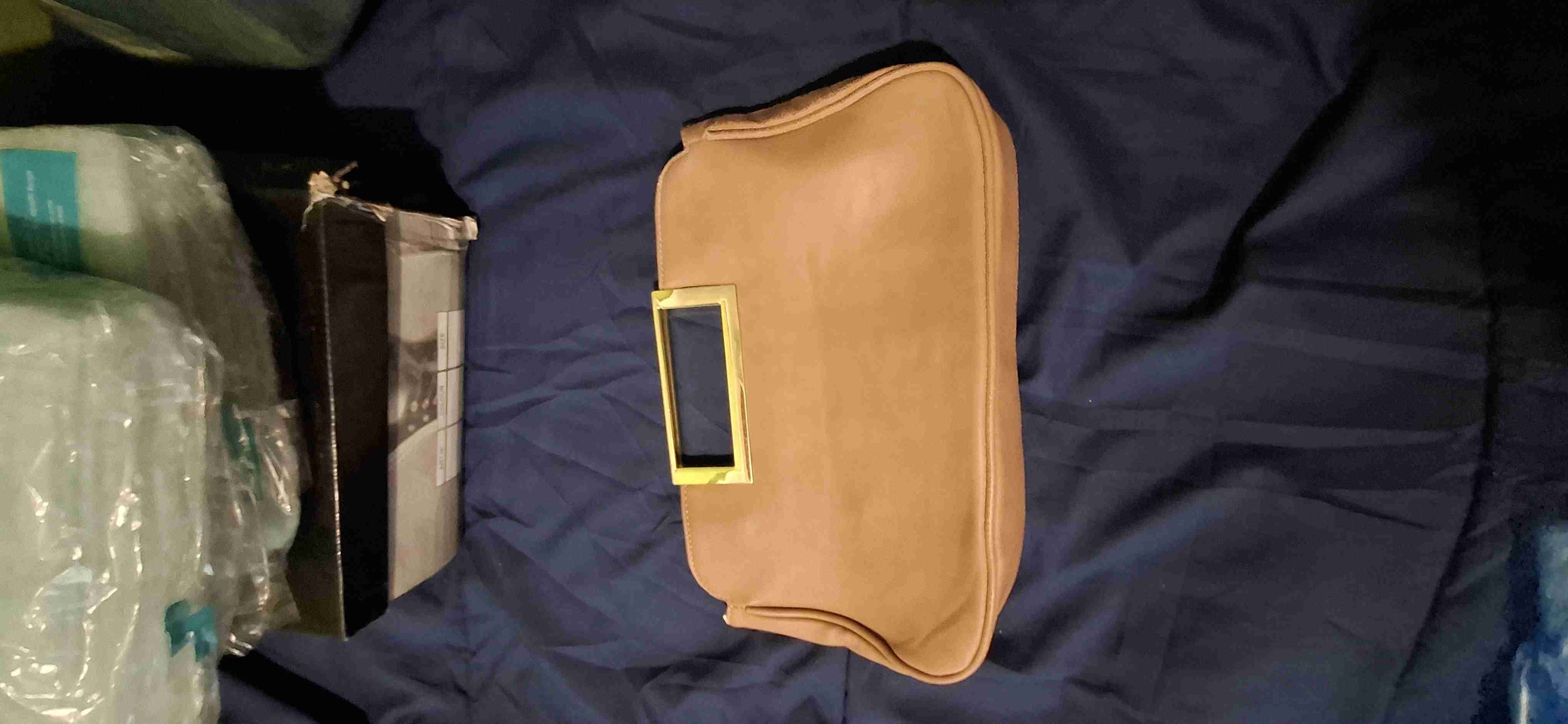 Cartera sobre café con detalle dorado