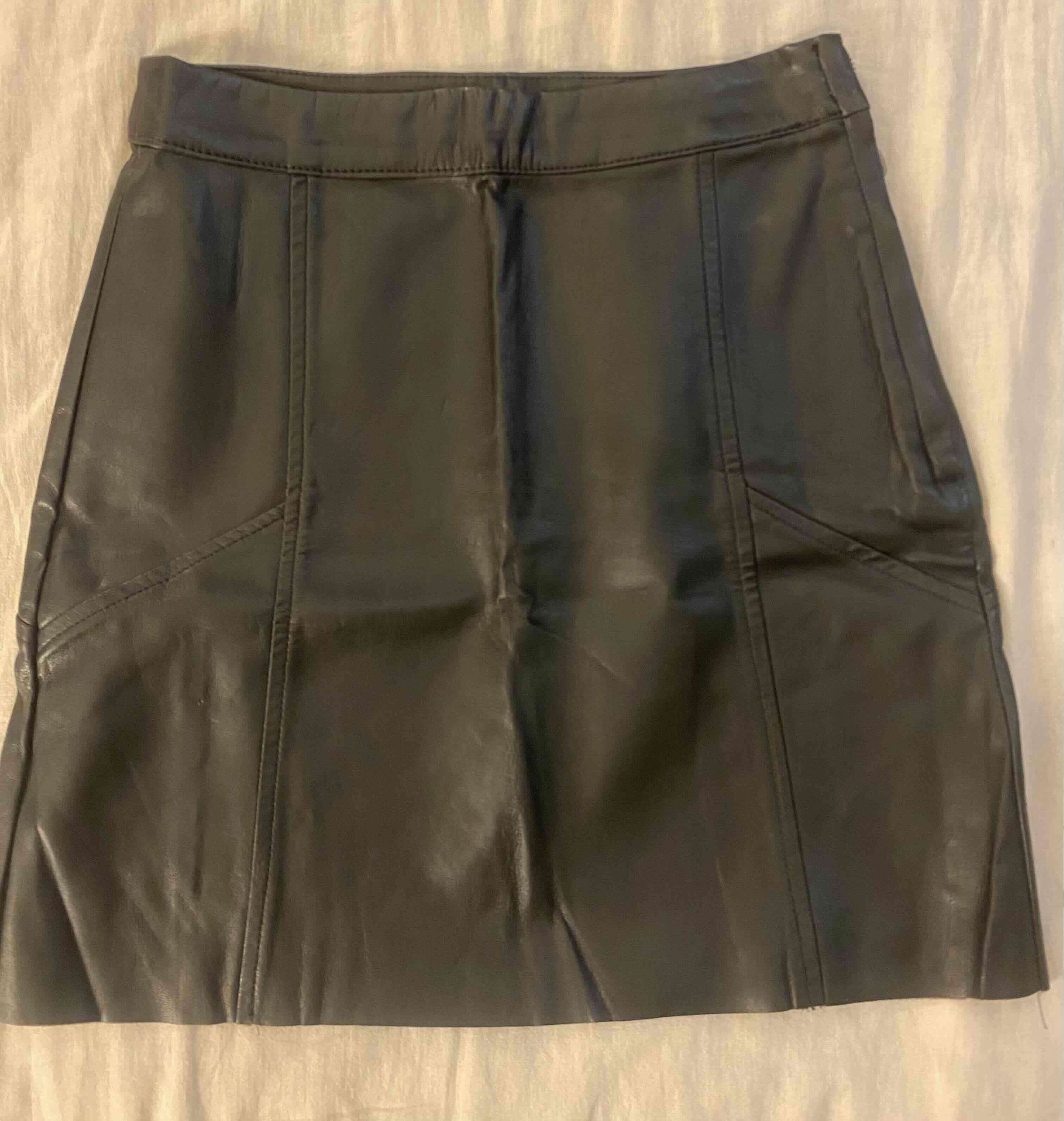 Falda de cuero sintético en color negro. Ideal para un look moderno y casual. En buen estado. Talla 36.