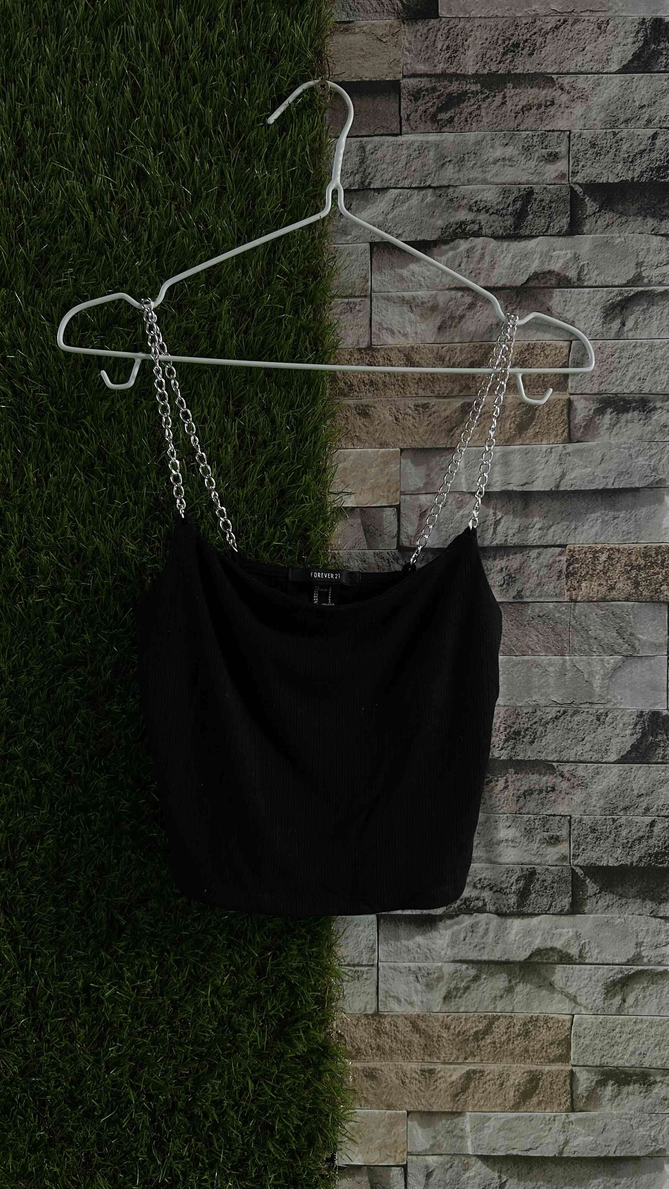Top negro elegante con tirantes de cadenas, perfecto para ocasiones especiales. En buen estado, marca forever 21