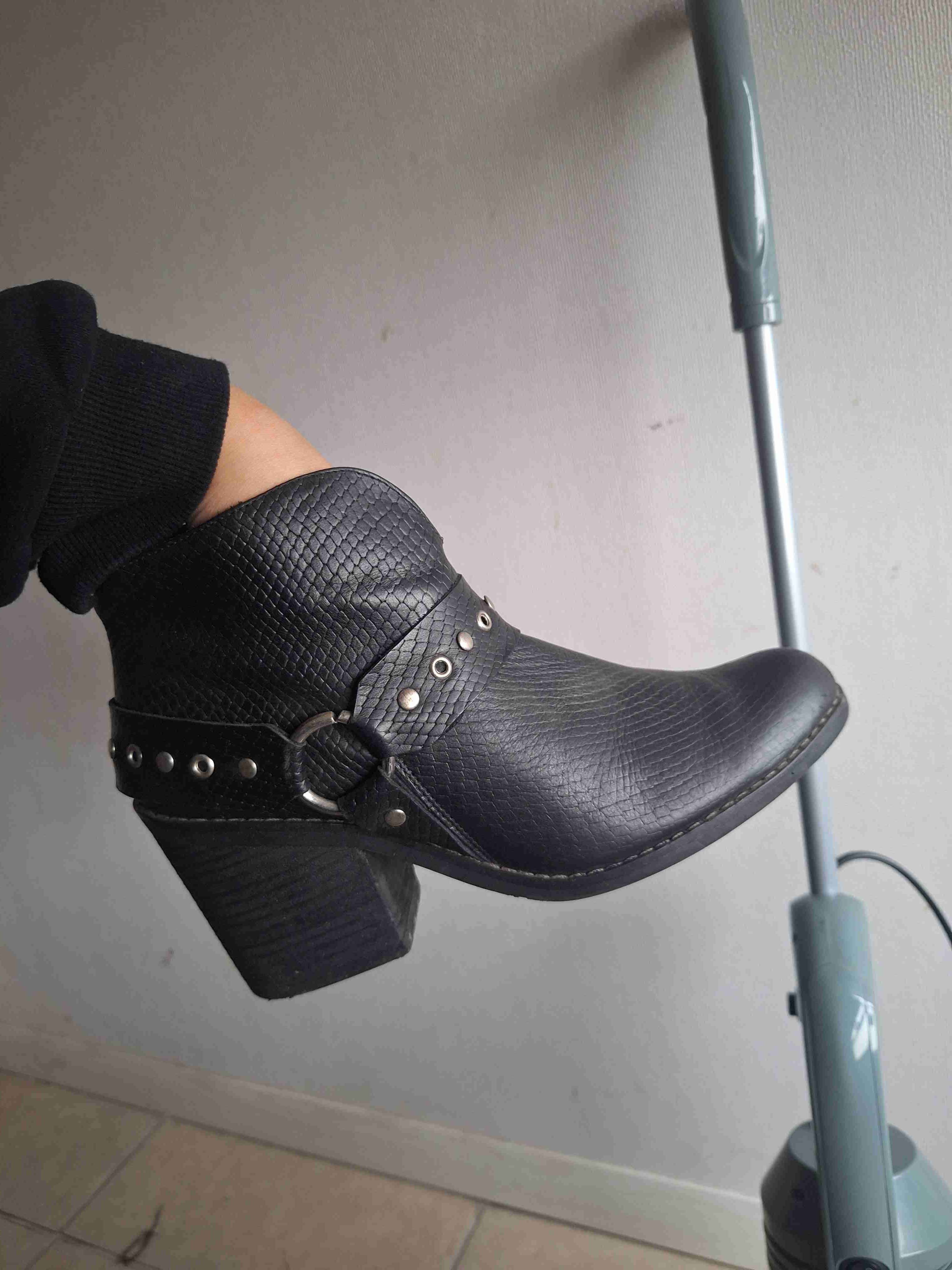Elegantes botines de cuero negros tipo reptil con detalle de tachas. En buen estado, perfectos para ocasiones formales o casuales.