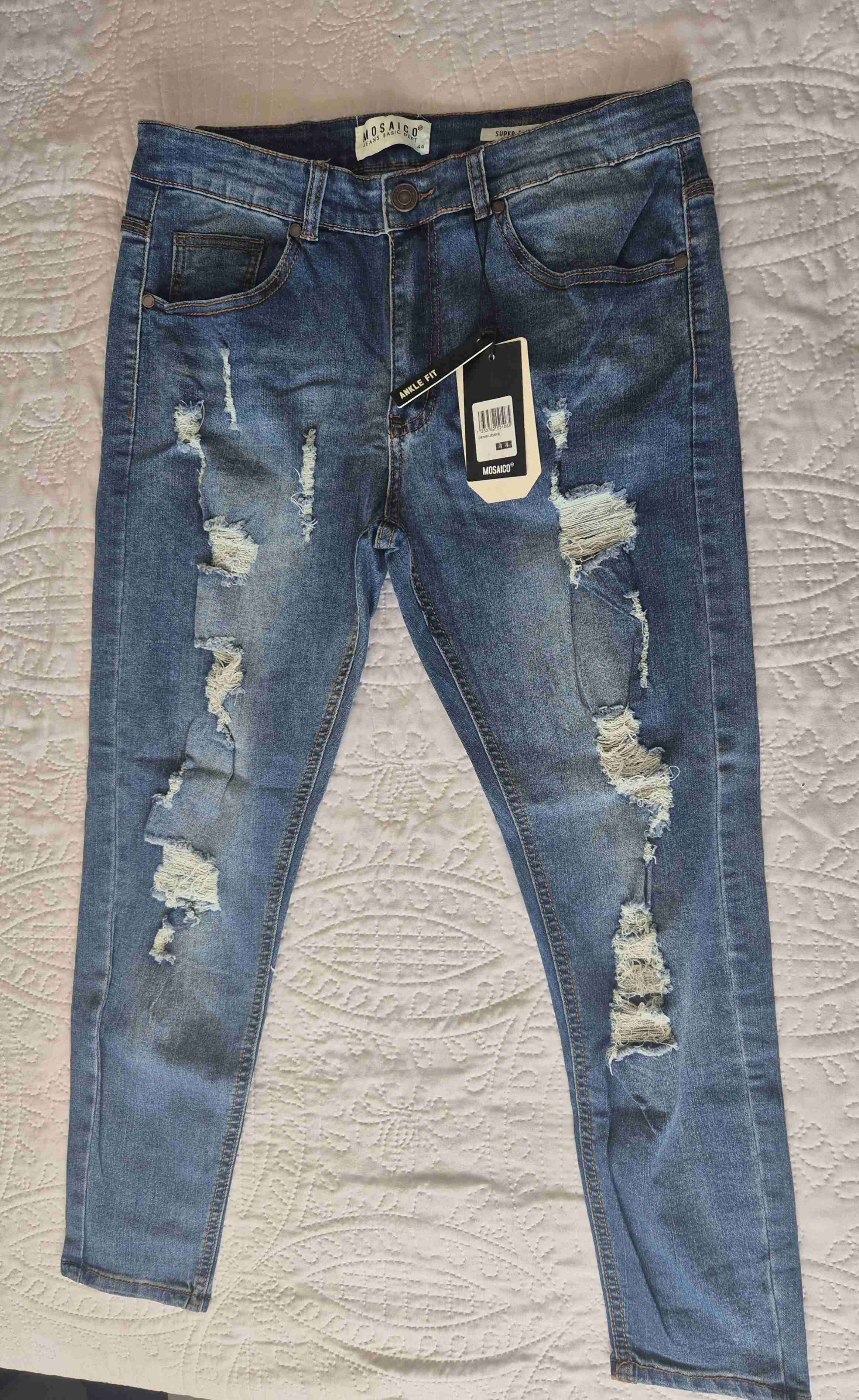 Jeans azul con diseño desgastado, etiqueta visible. Perfecto para un estilo casual y moderno. Esta nuevo con etiqueta Talla 14.