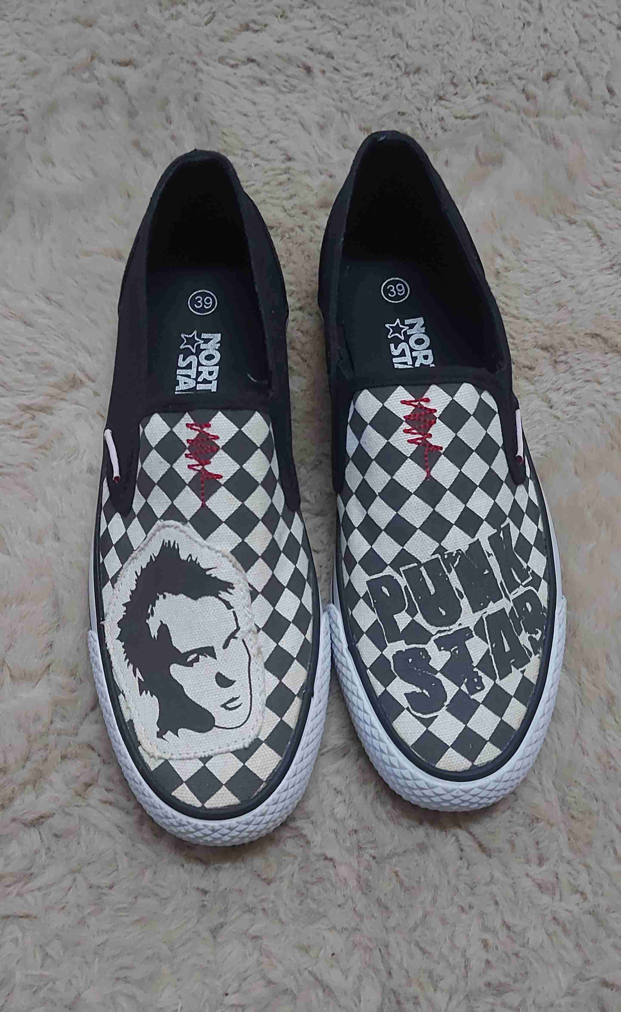 Zapatillas con diseño original de cuadros y detalle punk. En buen estado, perfectas para un look casual y único.