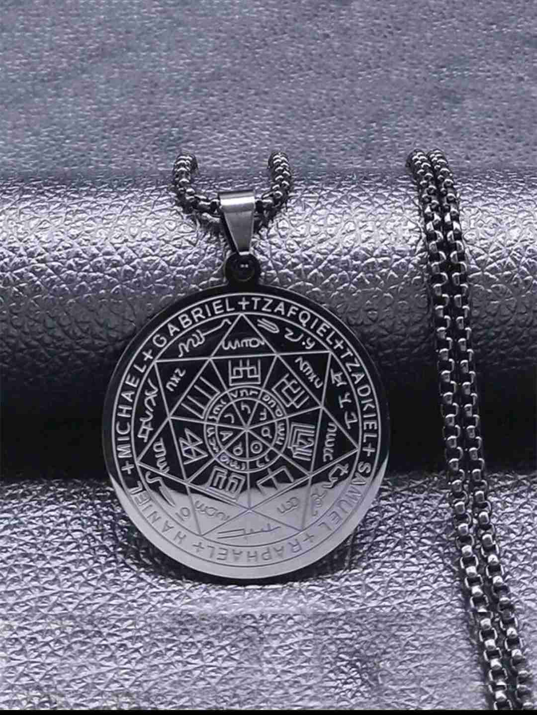Collar con medallón de diseño místico y detalles esotéricos. Ideal para quienes buscan un toque único en su estilo. En buen estado.
