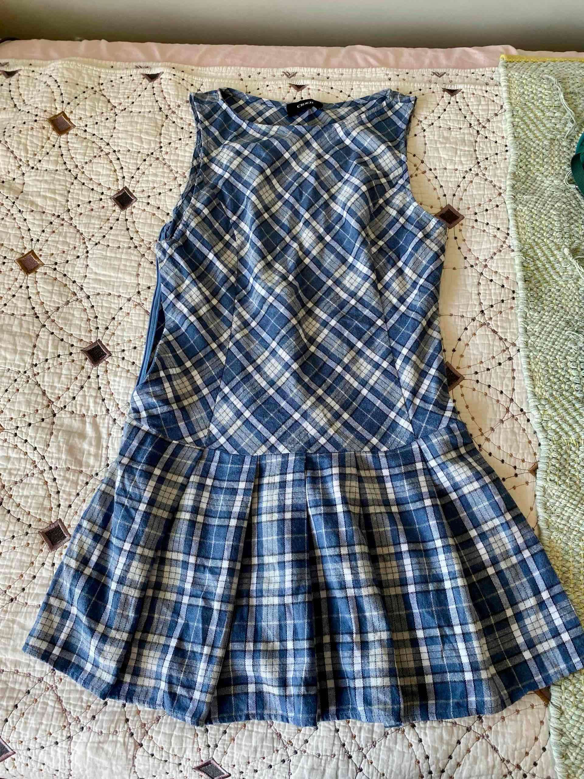 Vestido estilo escocés en tonos azul y gris, ideal para ocasiones casuales. En buen estado, cómodo y fresco para el verano.