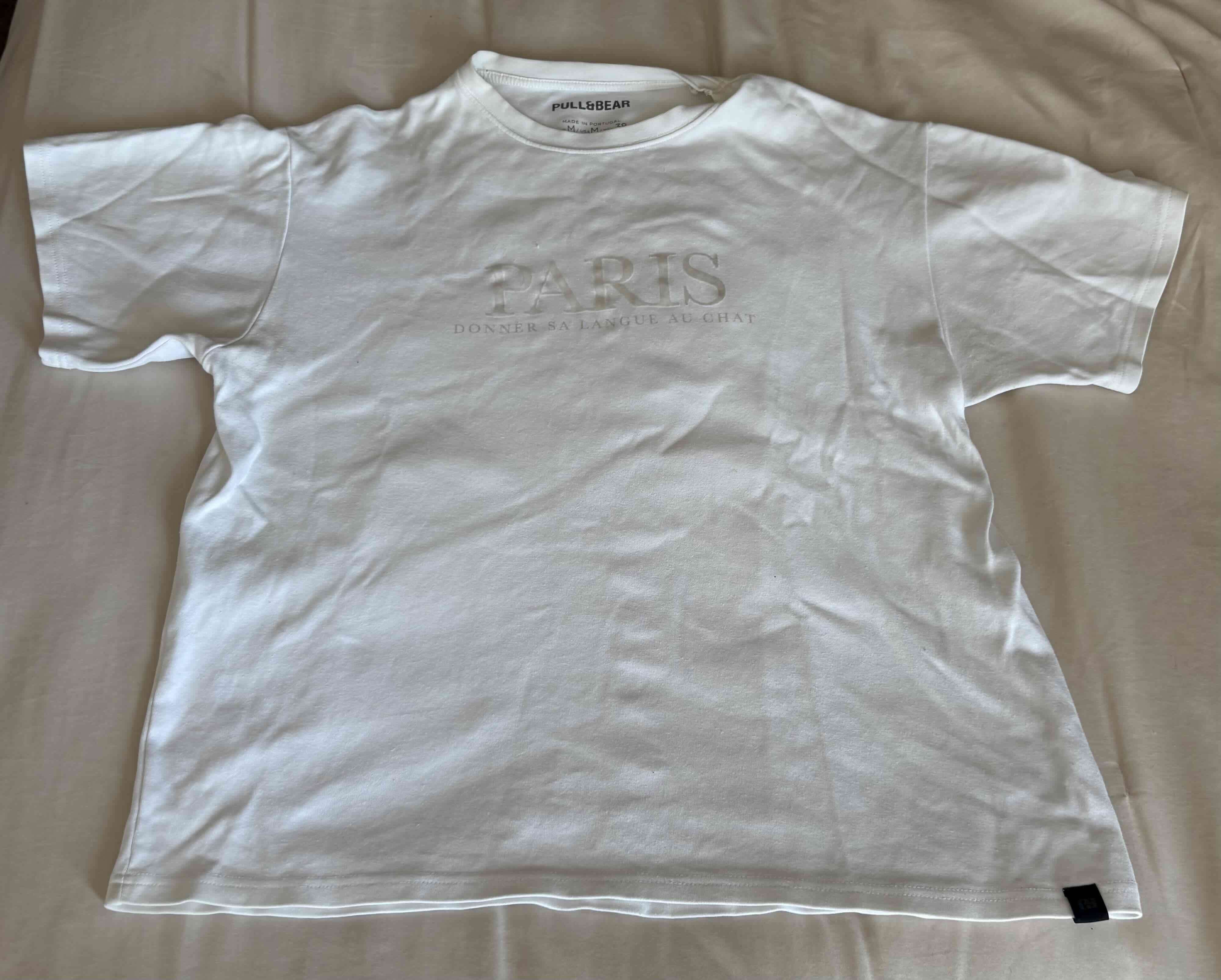 Polera blanca con estampado de París, moderna y casual. Ideal para uso diario. En buen estado.