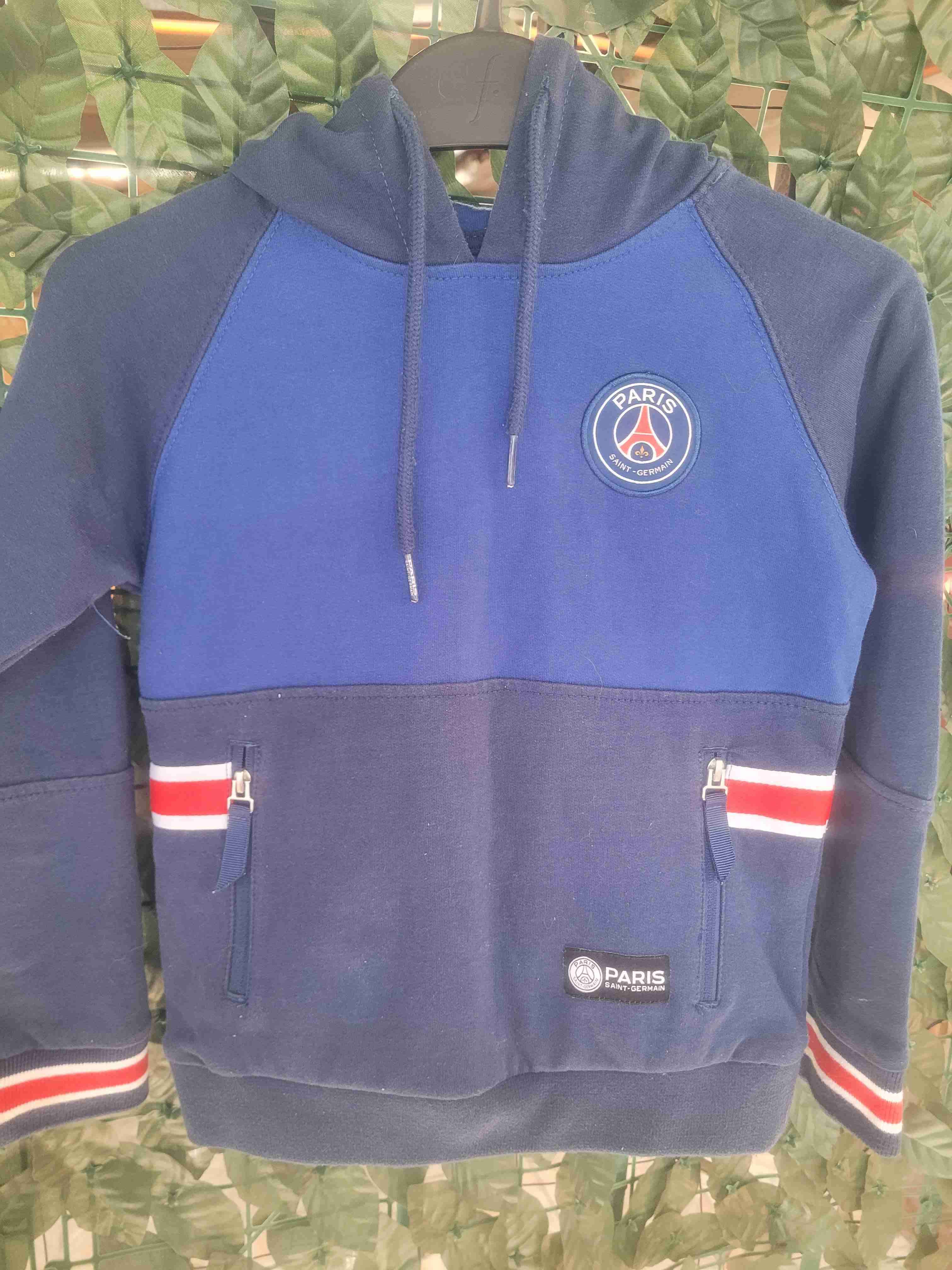 Polerón azul del PSG con capucha y bolsillos. Ideal para días fríos, en buen estado general.