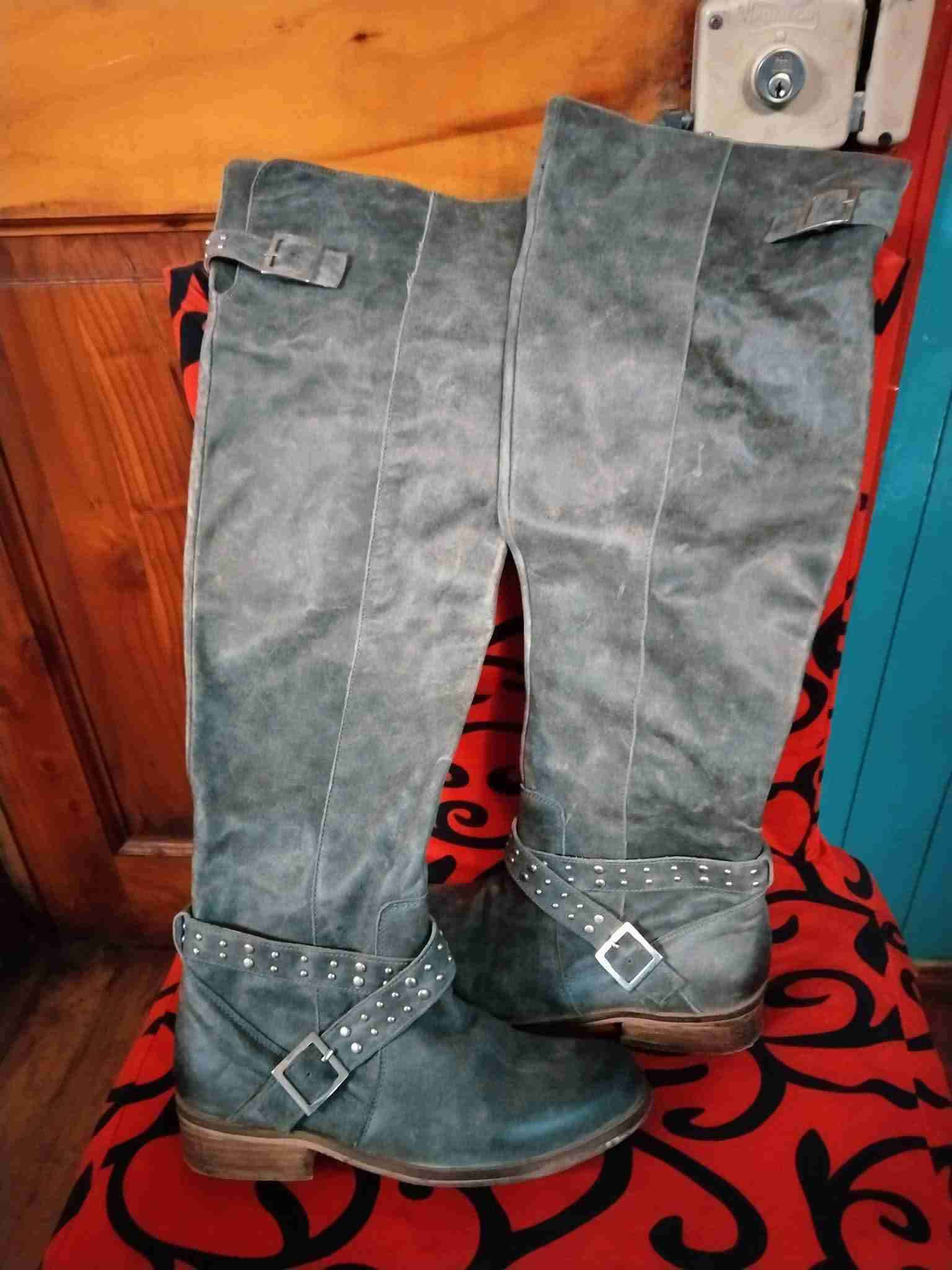 Elegantes botas altas de gamuza grises con detalles metálicos. En buen estado, perfectas para el otoño. Cómodas y estilosas.