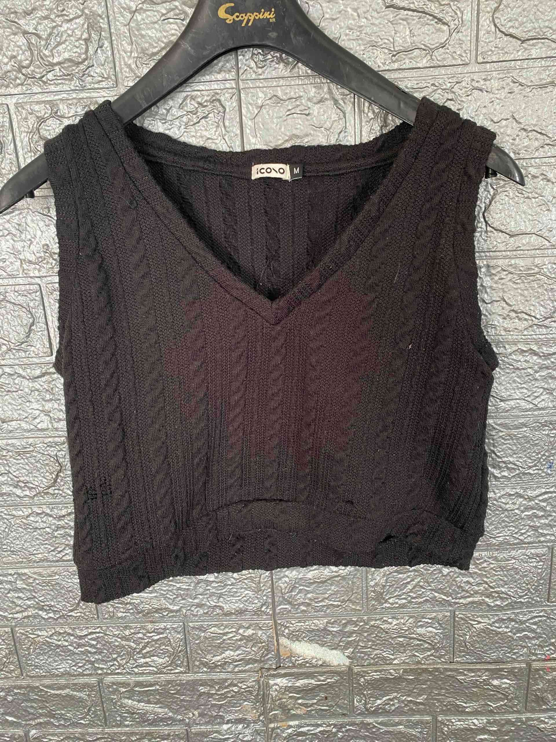 Chaleco de punto negro con escote en V. En buen estado, ideal para combinar con camisas o blusas.