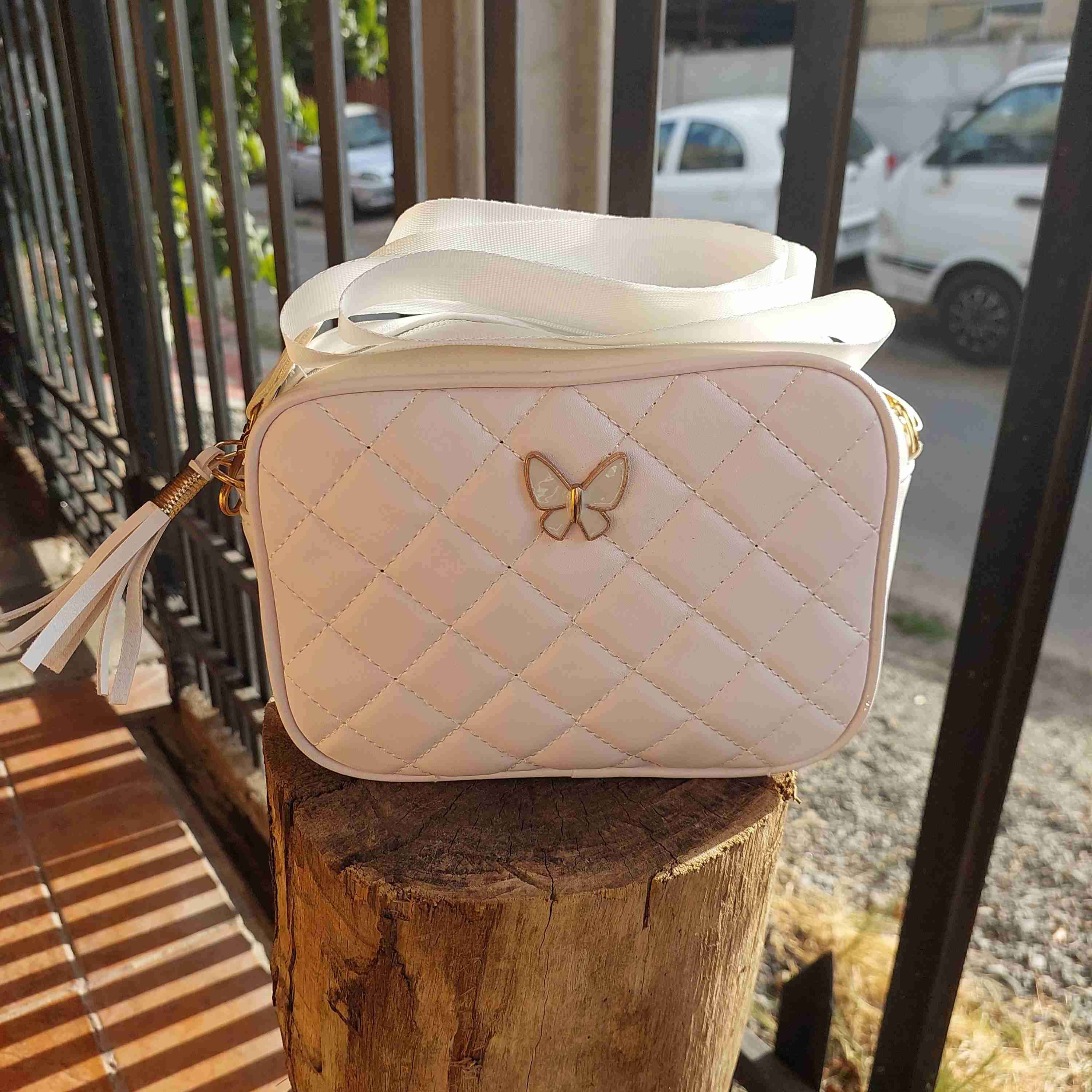 Bolso pequeño blanco con patrón acolchado y detalle de mariposa dorada. Ideal para salidas casuales. En buen estado.