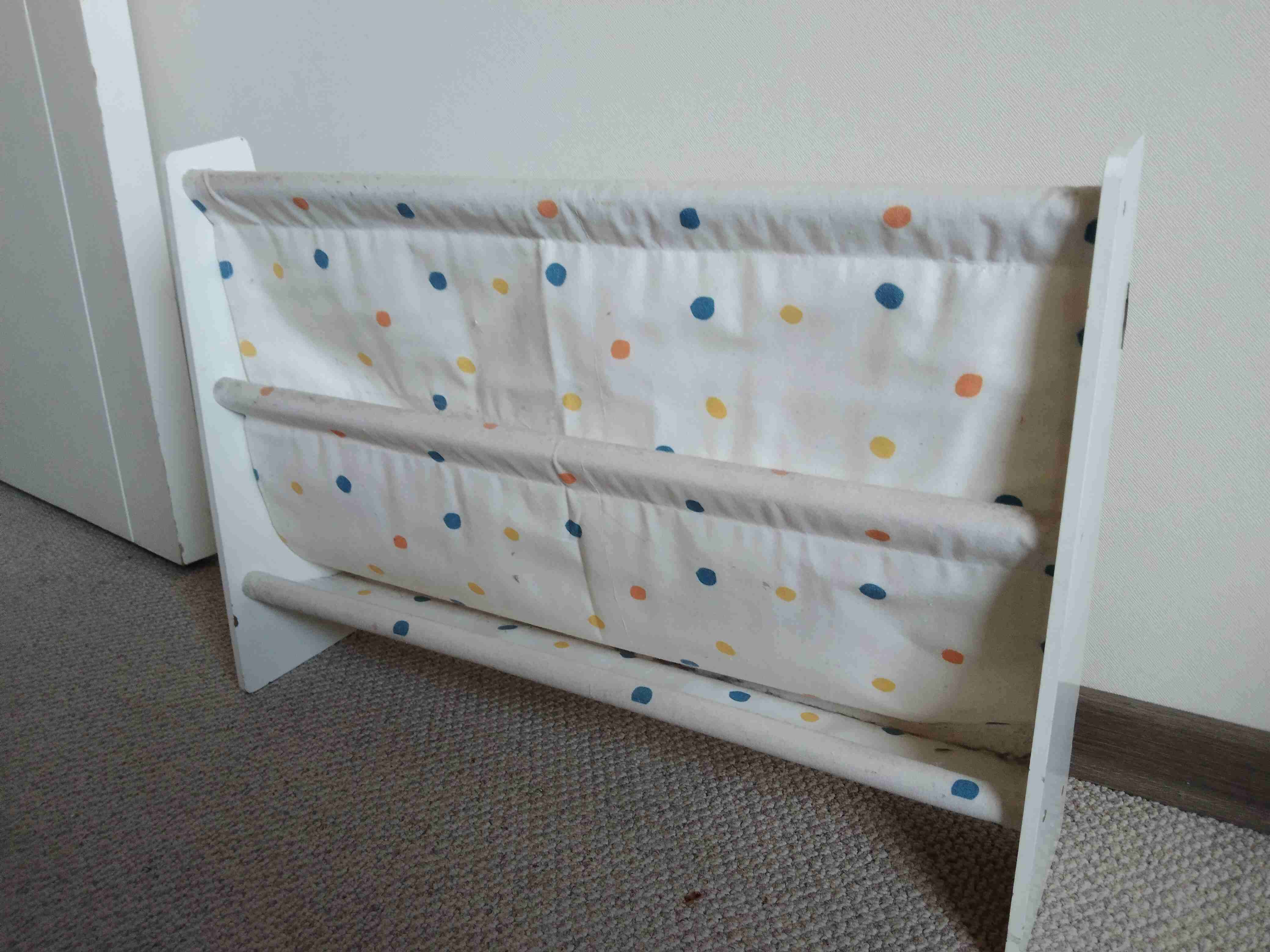 Lindo porta libros para niños, ideal para mantener la habitación ordenada. Diseño con lunares coloridos. Material de tela y madera. Excelente estado. Medidas 70 largo, 48 alto, 16 profundidad. Se vende por mudanza