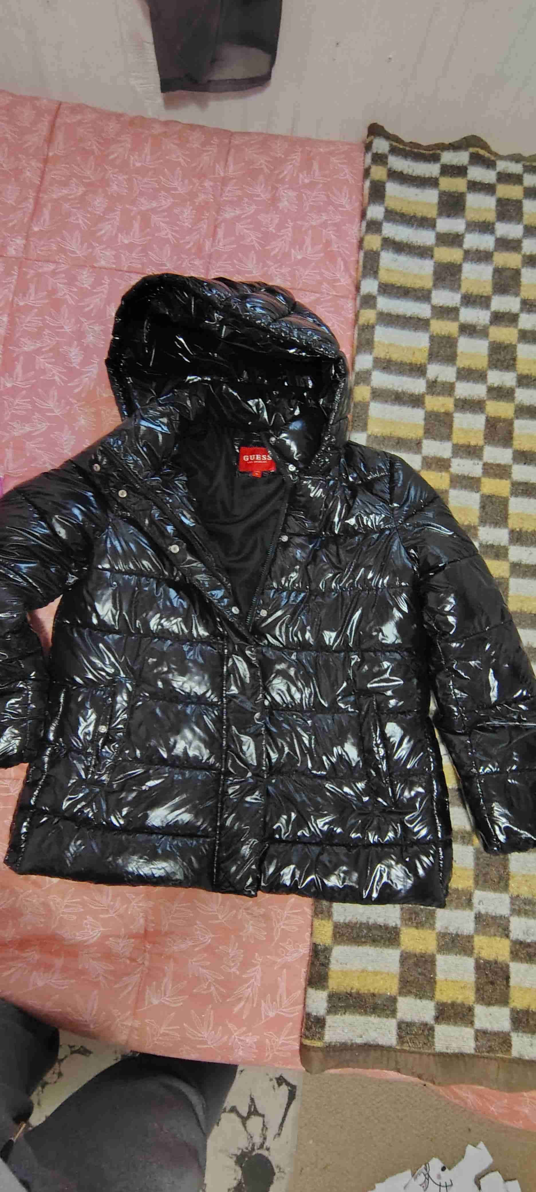 Parca negra con diseño acolchado y capucha. Perfecta para mantener el calor en invierno. En buen estado general.