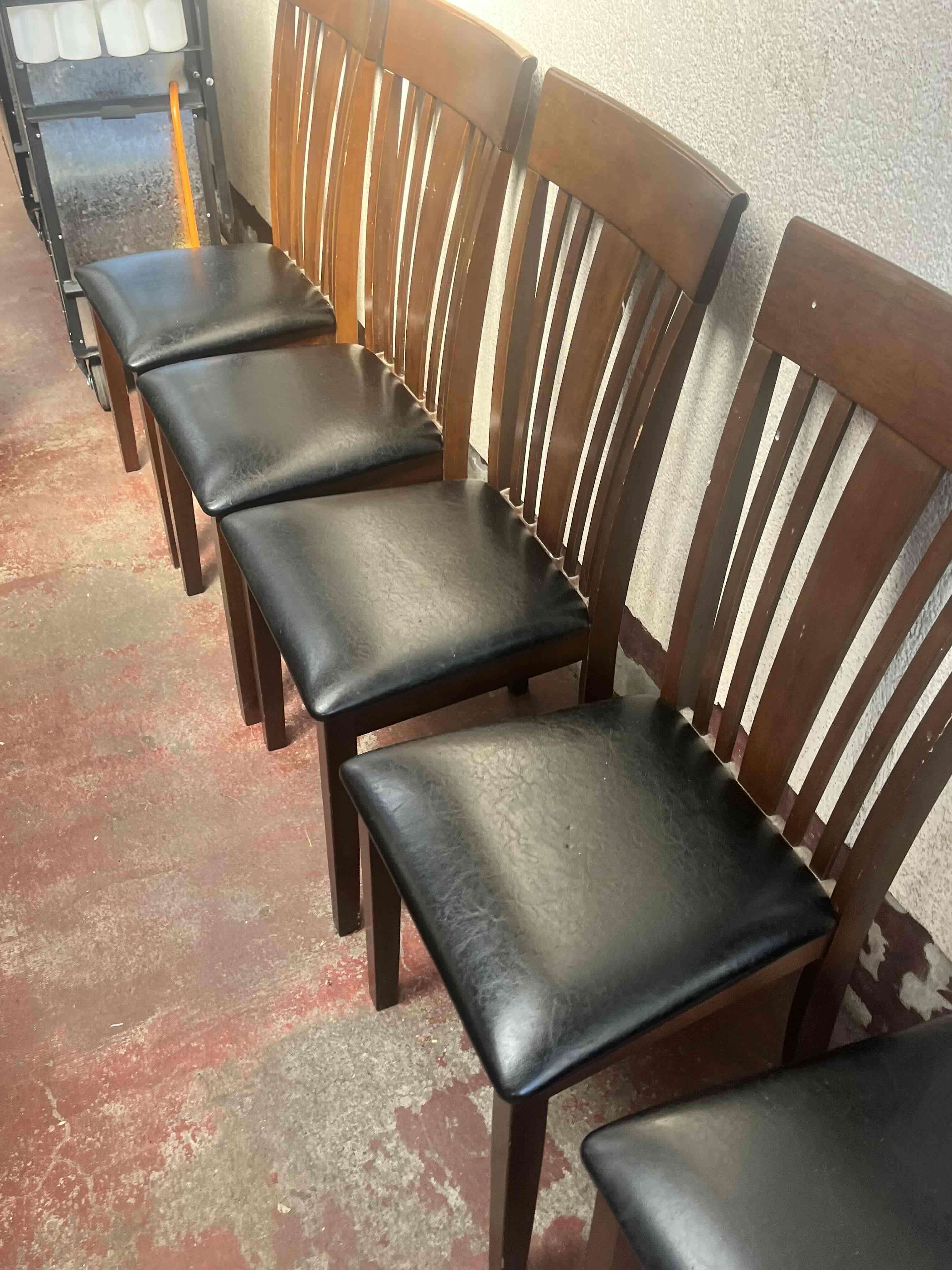 Cuatro sillas de madera con asiento de cuero sintético negro. En buen estado, ideal para comedores.