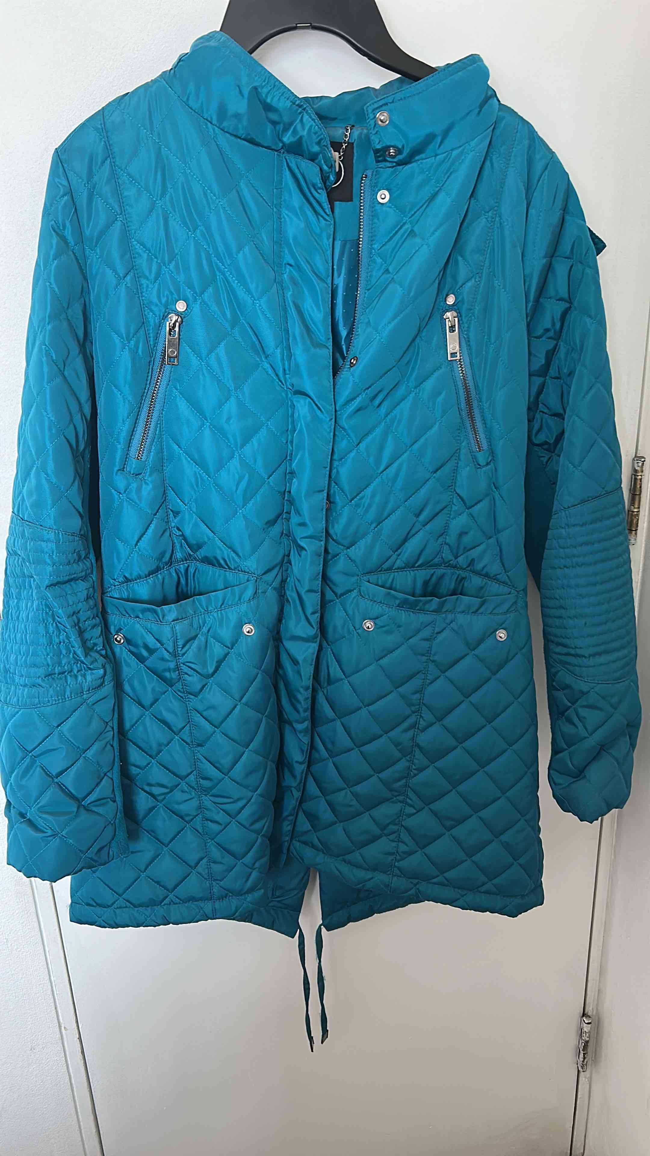 Chaqueta acolchada de color turquesa en buen estado. Ideal para el invierno, con cierre delantero y bolsillos amplios. Úsala para mantenerte cálida.