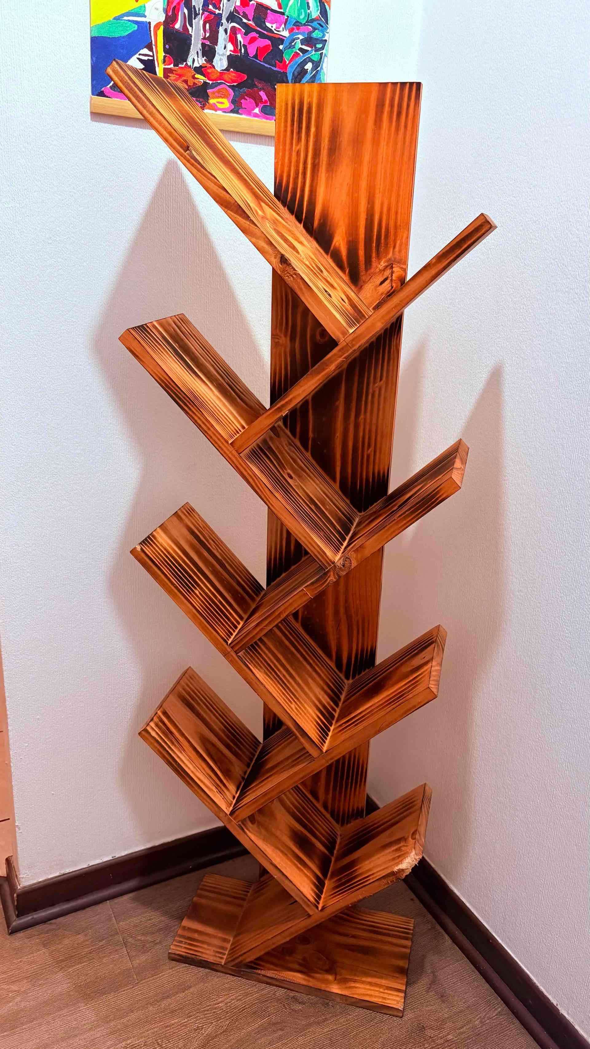 Elegante estante de madera hecho a mano, ideal para libros o decoración. En buen estado, con un diseño moderno.
