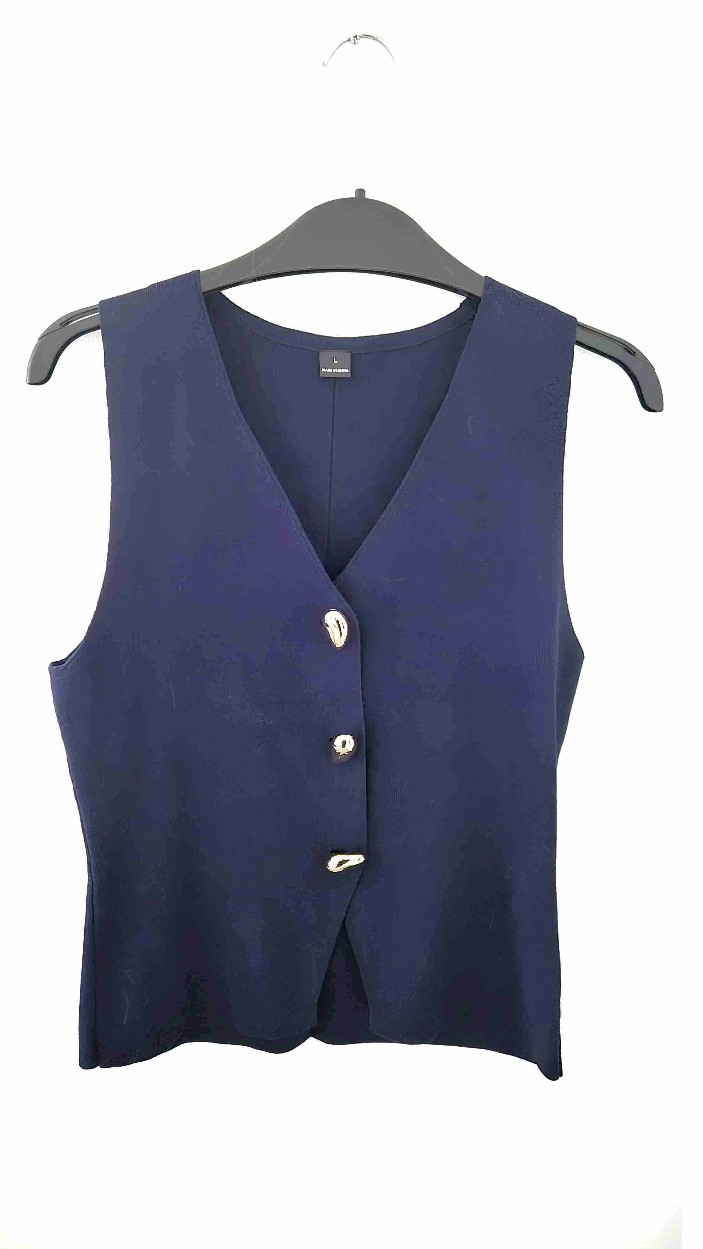 Chaleco sin mangas de color azul con botones dorados. Ideal para un look formal o casual.
