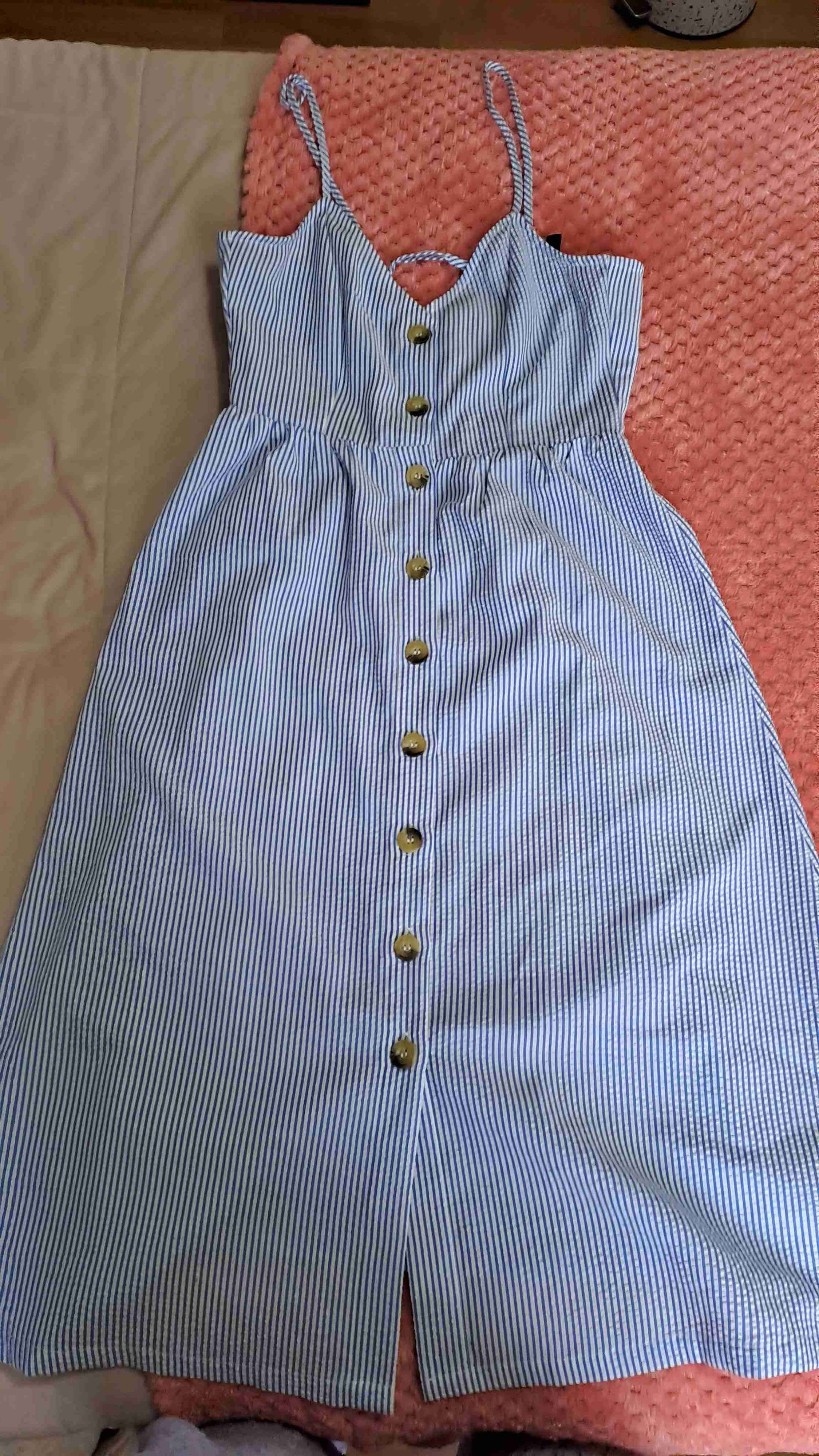 Vestido estilo casual con rayas azules y botones al frente. Perfecto para el verano U otros.