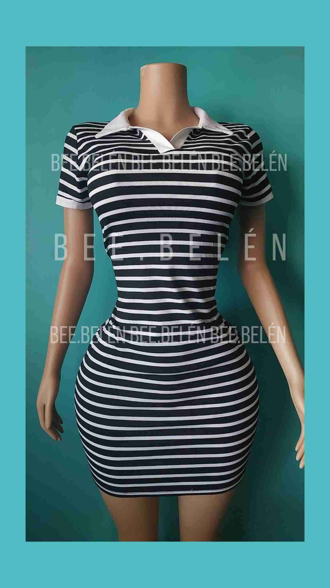 Vestido ajustado con estampado de rayas blancas y negras. Perfecto para un look casual elegante. Nuevo. Con cuello en v, talla estandar que abarca hasta la xl