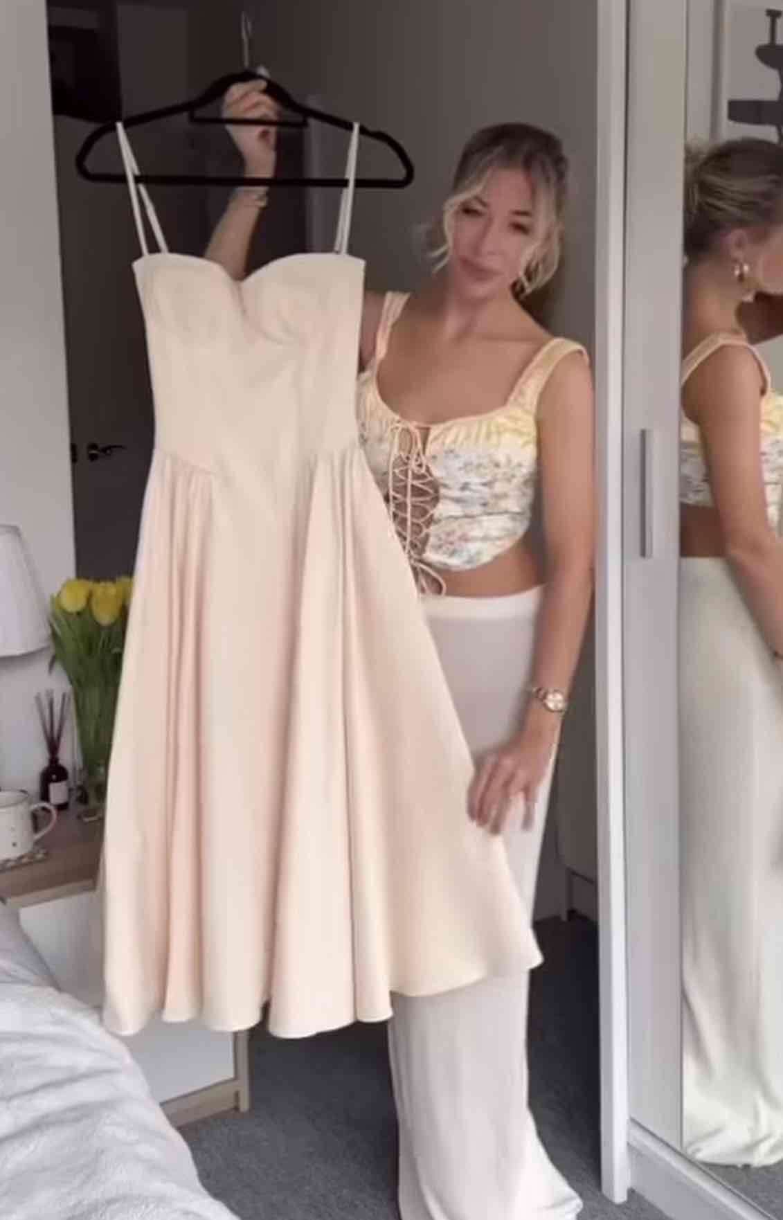 Elegante vestido beige talla M, perfecto para eventos formales. Hermoso, nuevo sin uso.
