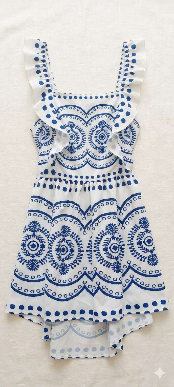 Hermoso vestido blanco con estampado azul, ideal para el verano. En buen estado, perfecto para ocasiones casuales.