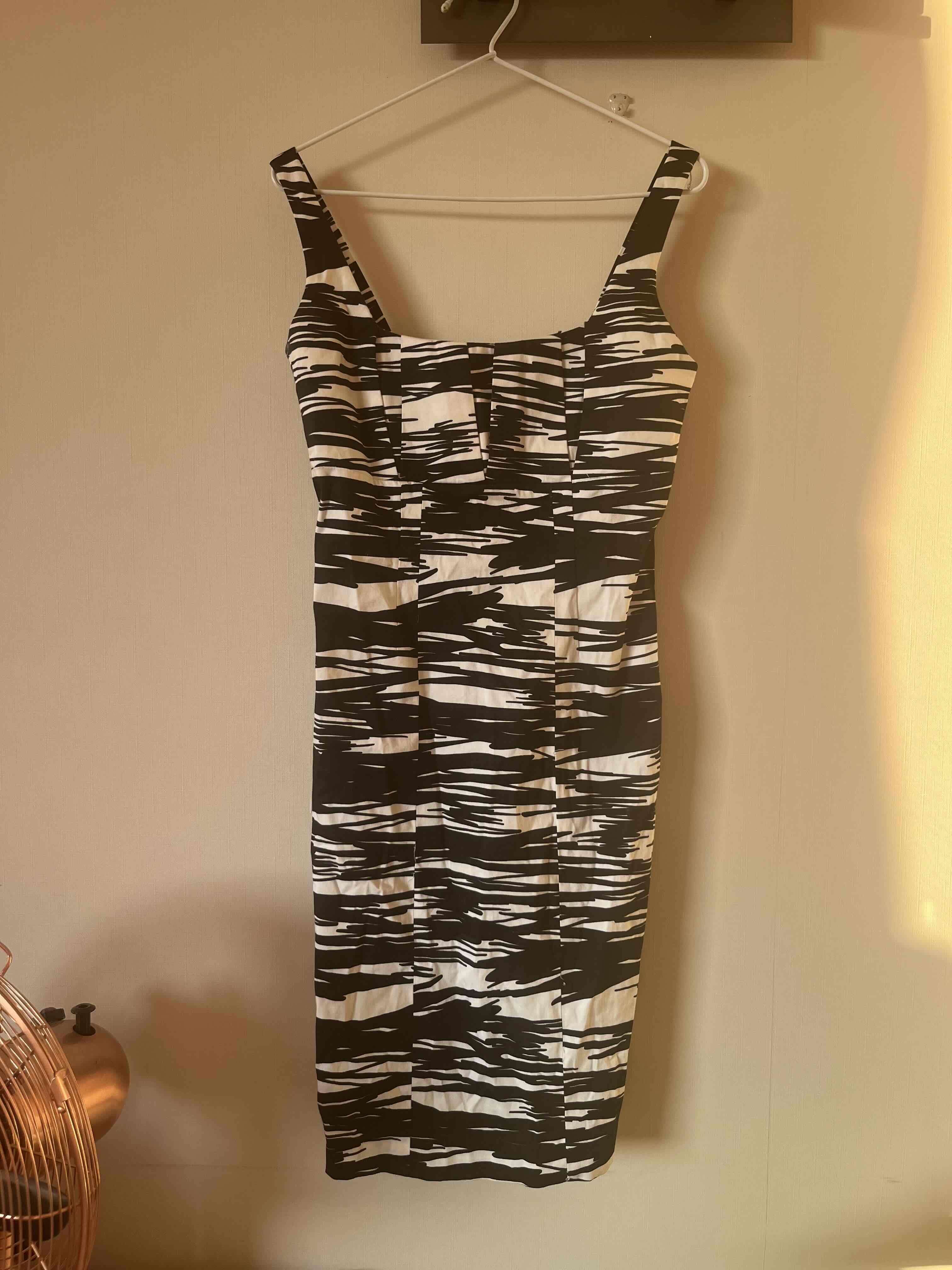 Vestido elegante con estampado abstracto en blanco y negro Calvin Klein. Ideal para eventos formales o una cena especial. Talla S