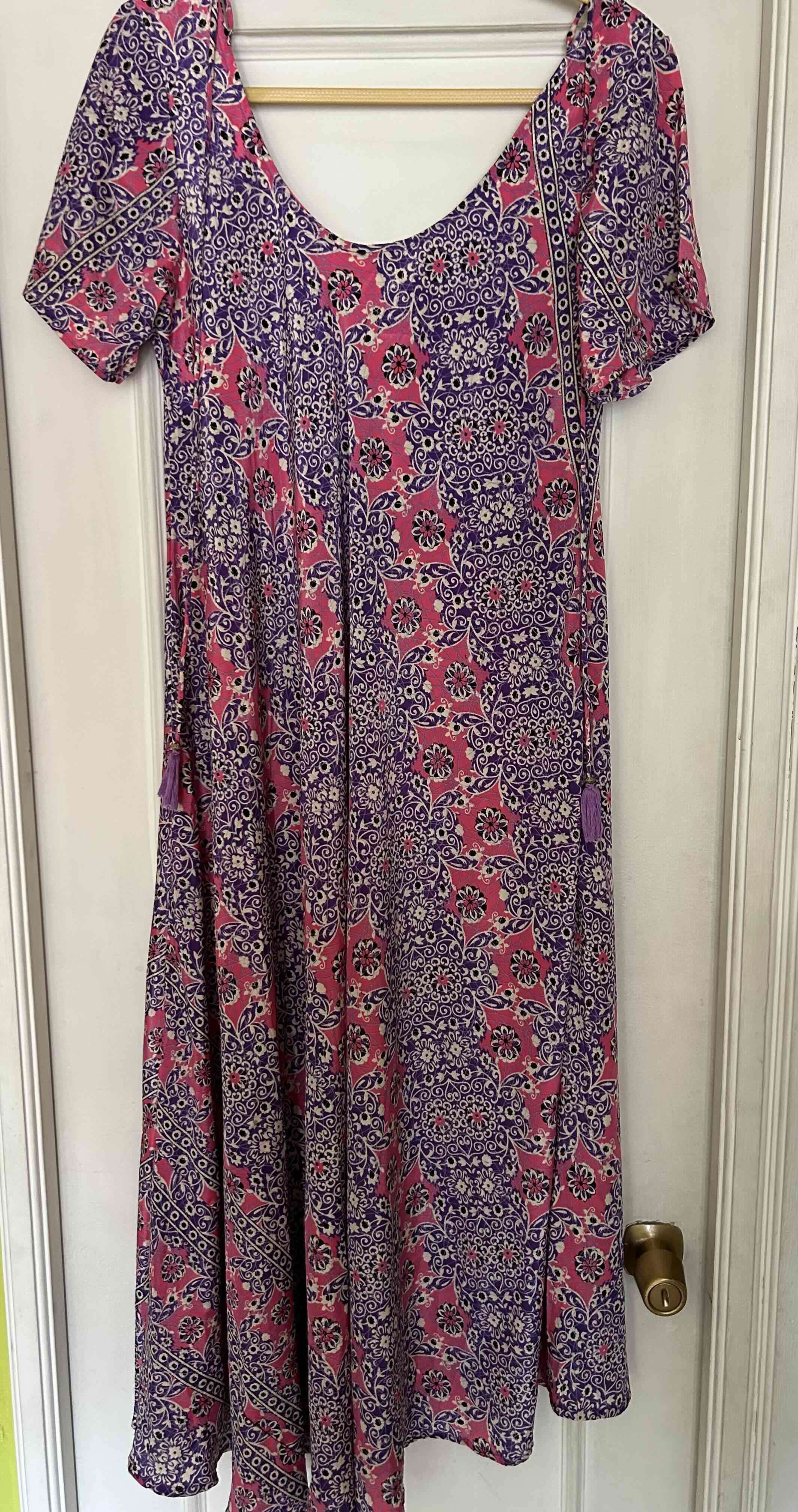 Vestido bohemio con estampado floral en tonos rosados y morados. Ideal para ocasiones casuales, en buen estado.