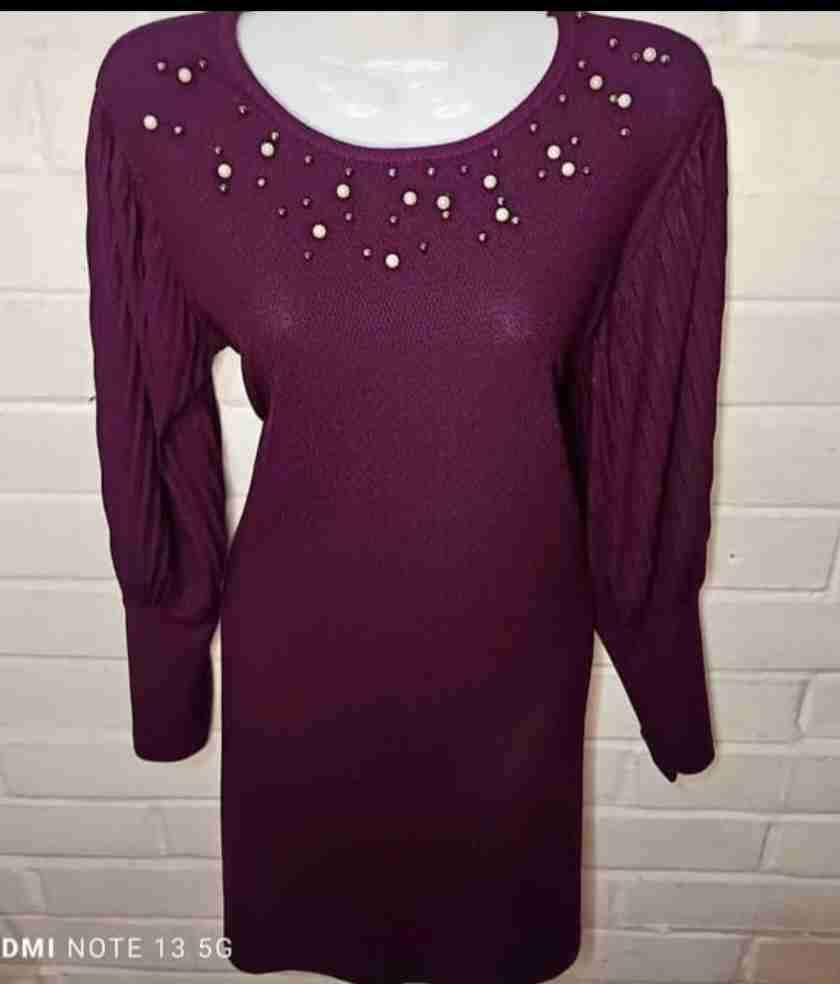 Elegante vestido con detalles de perlas en el cuello. Ideal para ocasiones especiales. Tela crepé