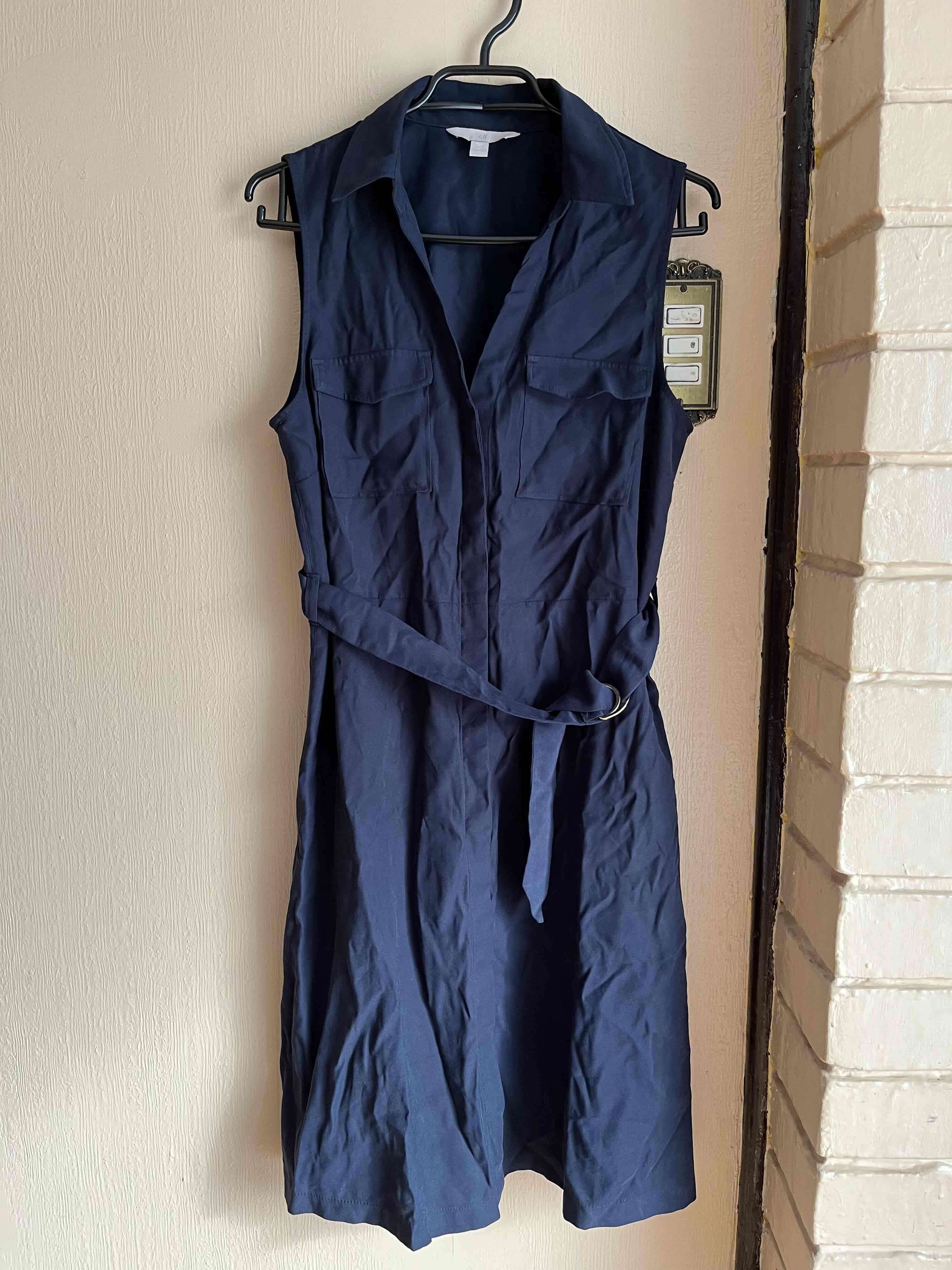 Vestido estilo camisero en azul oscuro. En buen estado, ideal para ocasiones informales. Incluye cinturón a juego. Talla 38 HyM