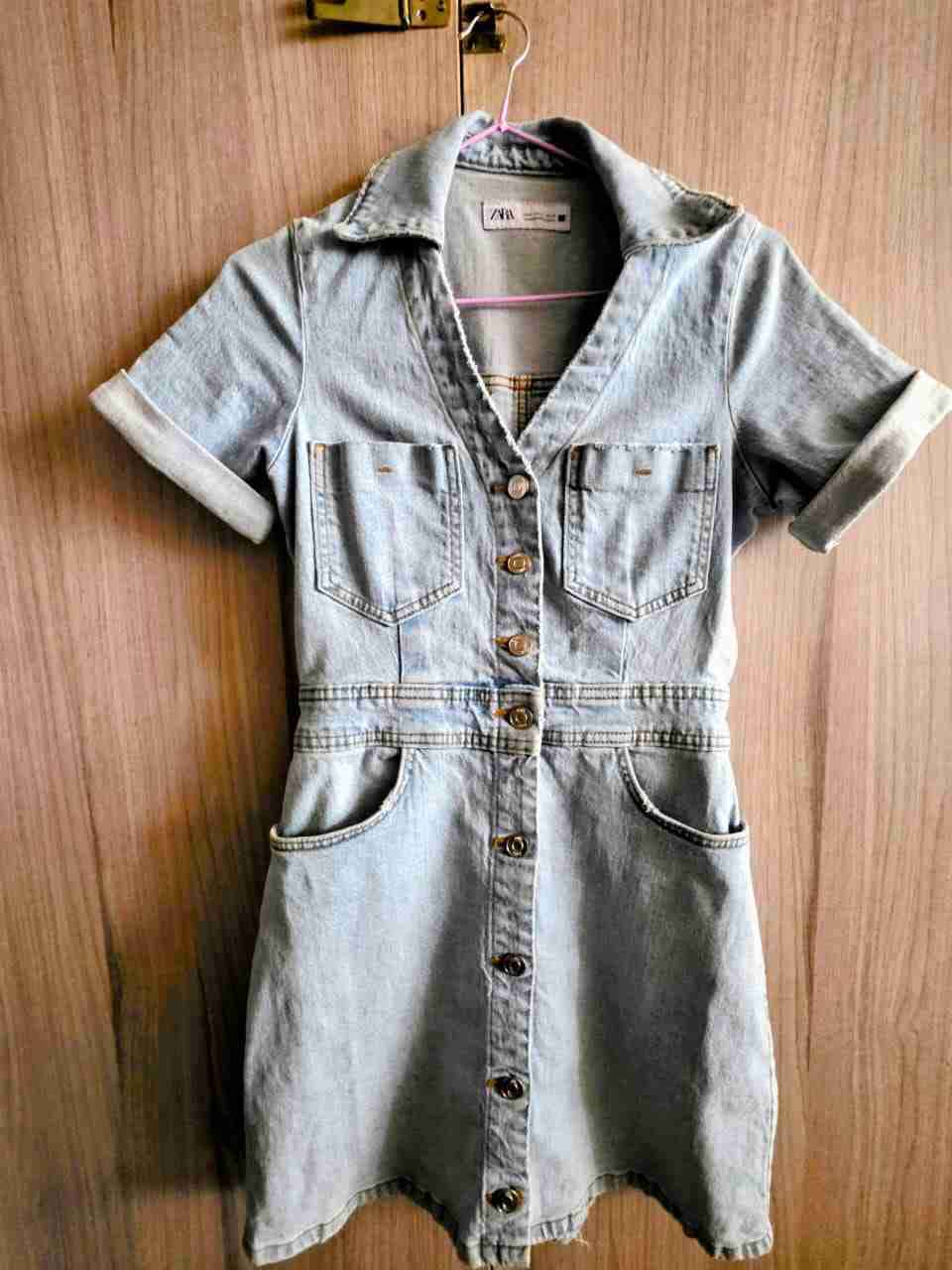 Vestido corto tipo camisero en denim claro. Perfecto para un look casual, en buen estado. Talla S