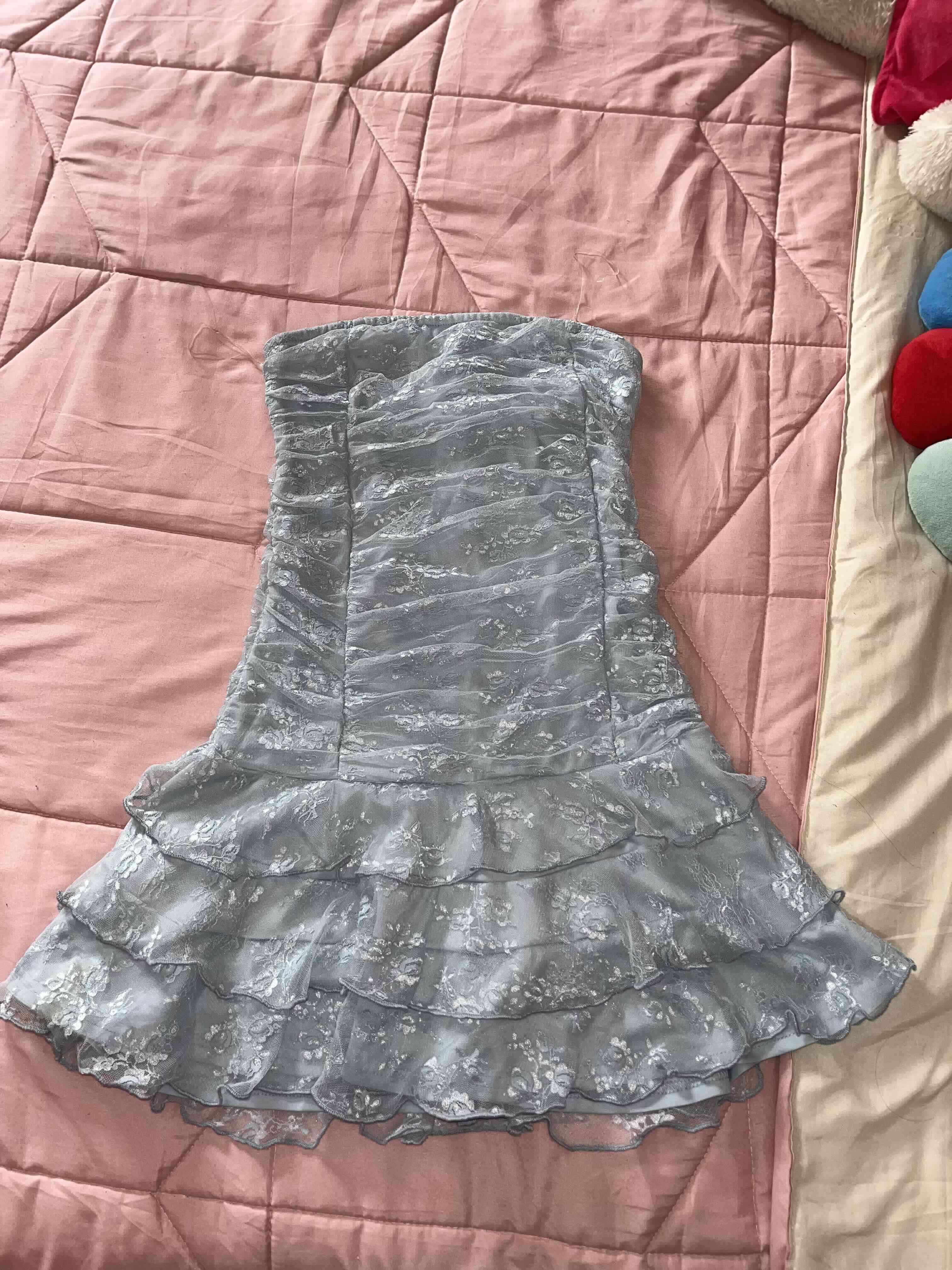 Elegante vestido corto de encaje celeste, ideal para eventos formales. En buen estado, con diseño de volantes y sin tirantes.