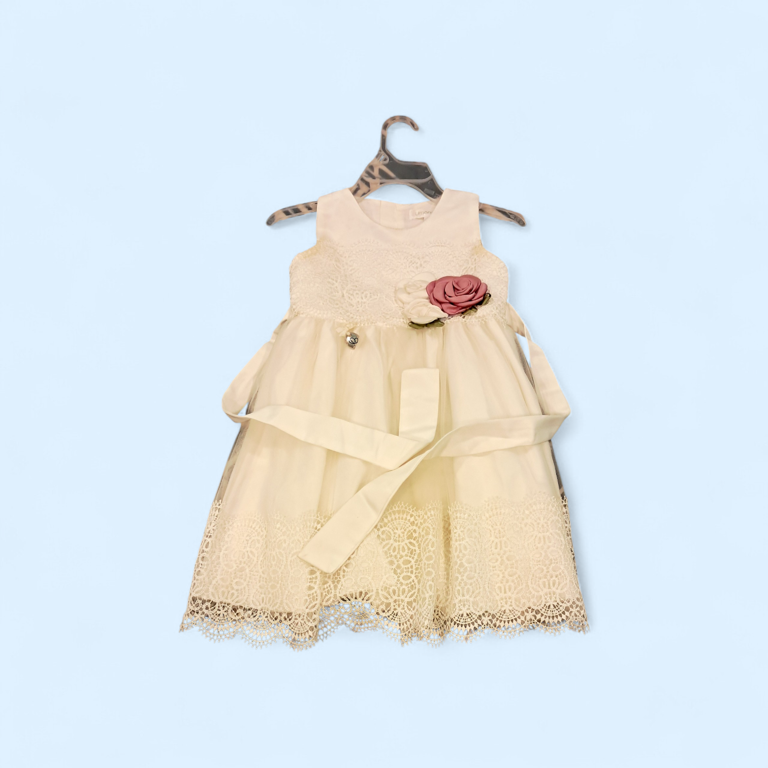 Hermoso vestido de niña en tono crema con detalle de flor rosa. Ideal para ocasiones especiales. Talla 6, un solo uso. En perfecto estado.
