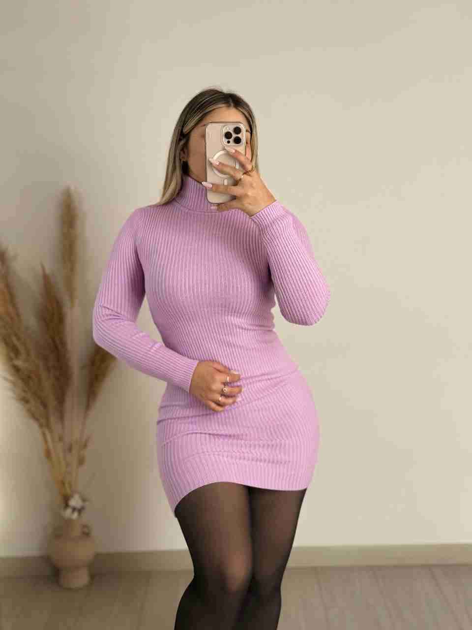 Vestido ajustado de lanilla de manga larga con cuello color lila, ideal para el otoño. Talla estandar que abarca hasta la xl