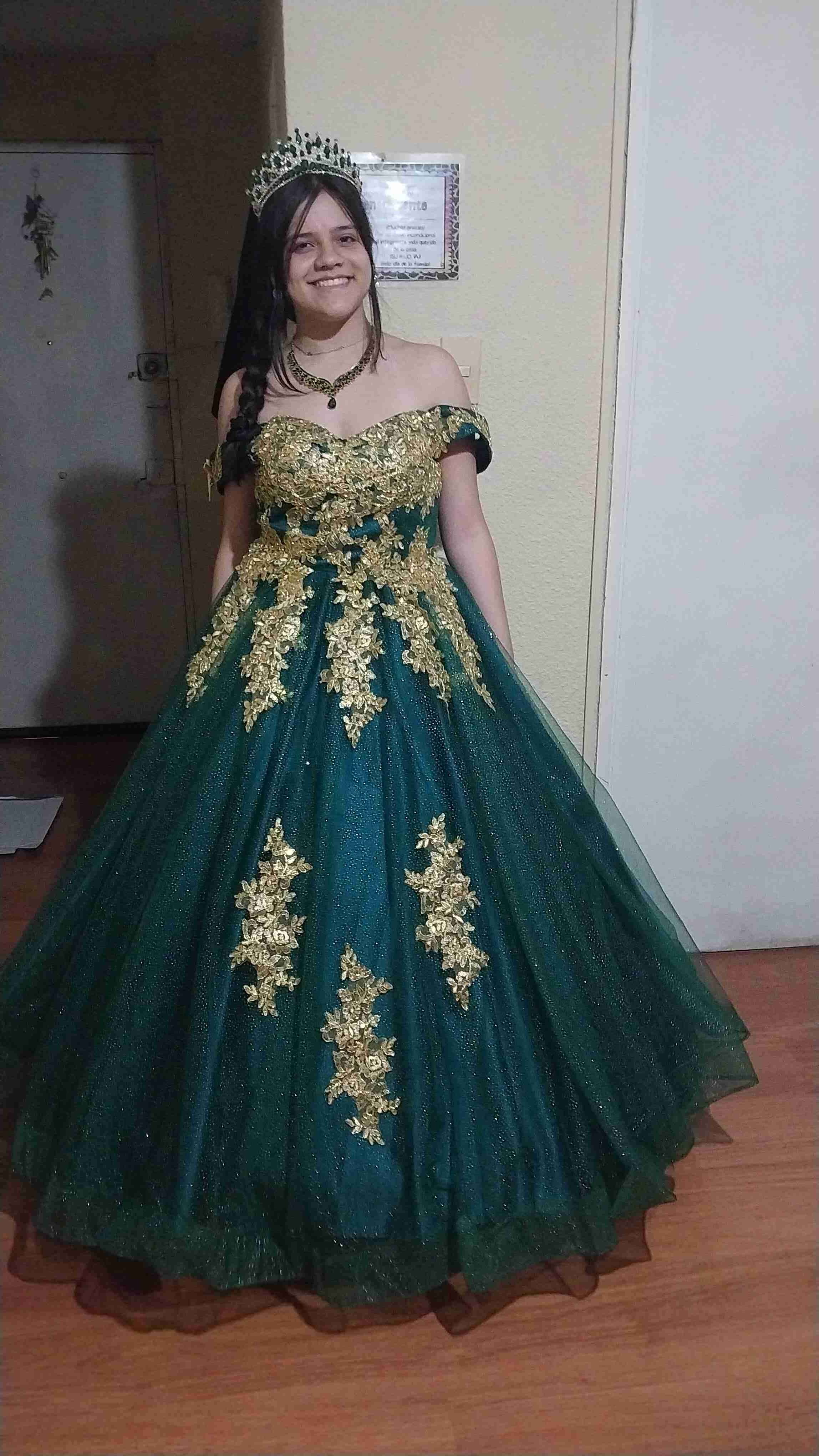 Hermoso vestido de fiesta en verde oscuro con adornos dorados. Ideal para eventos formales. Usado en buenas condiciones. con su armador Corona con apliques en verde y dorado