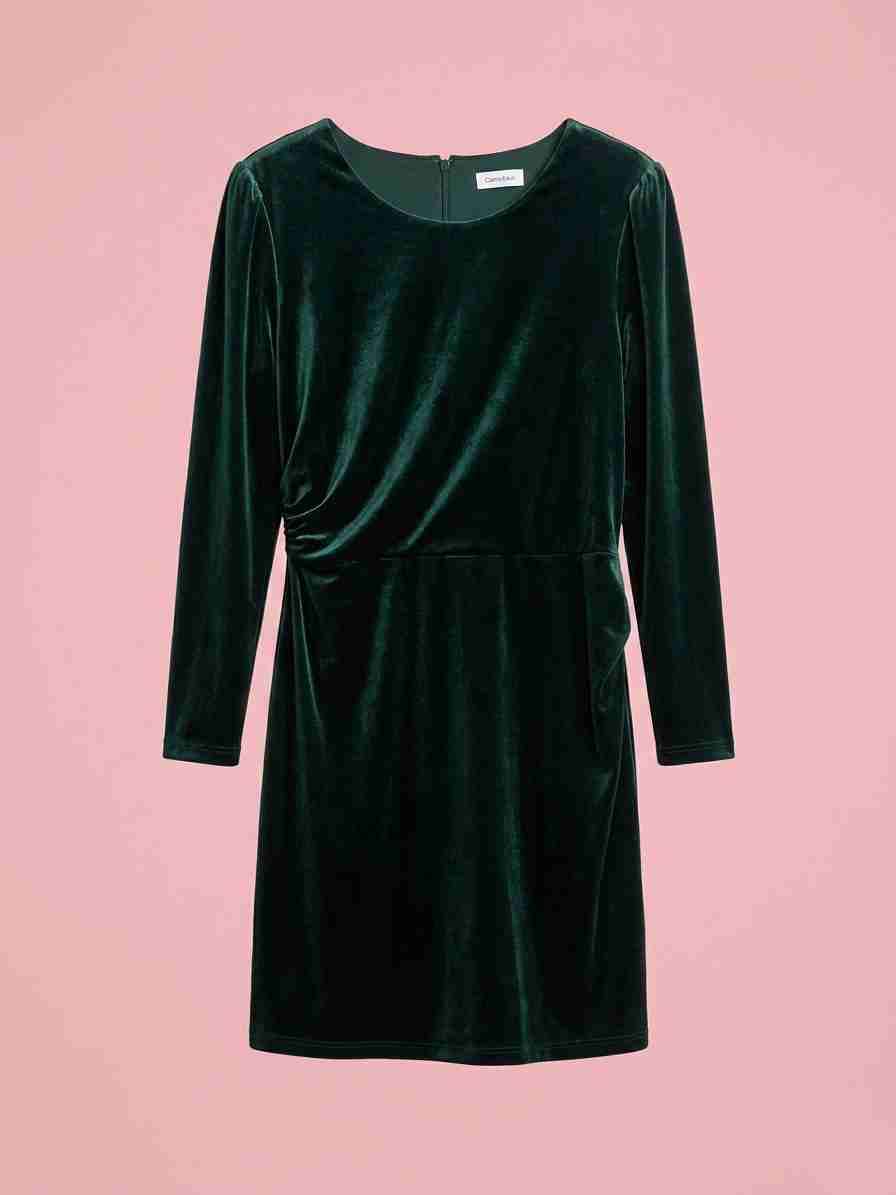 Vestido elegante de terciopelo verde botella, ideal para ocasiones especiales. Calvin Klein, Buen estado general.