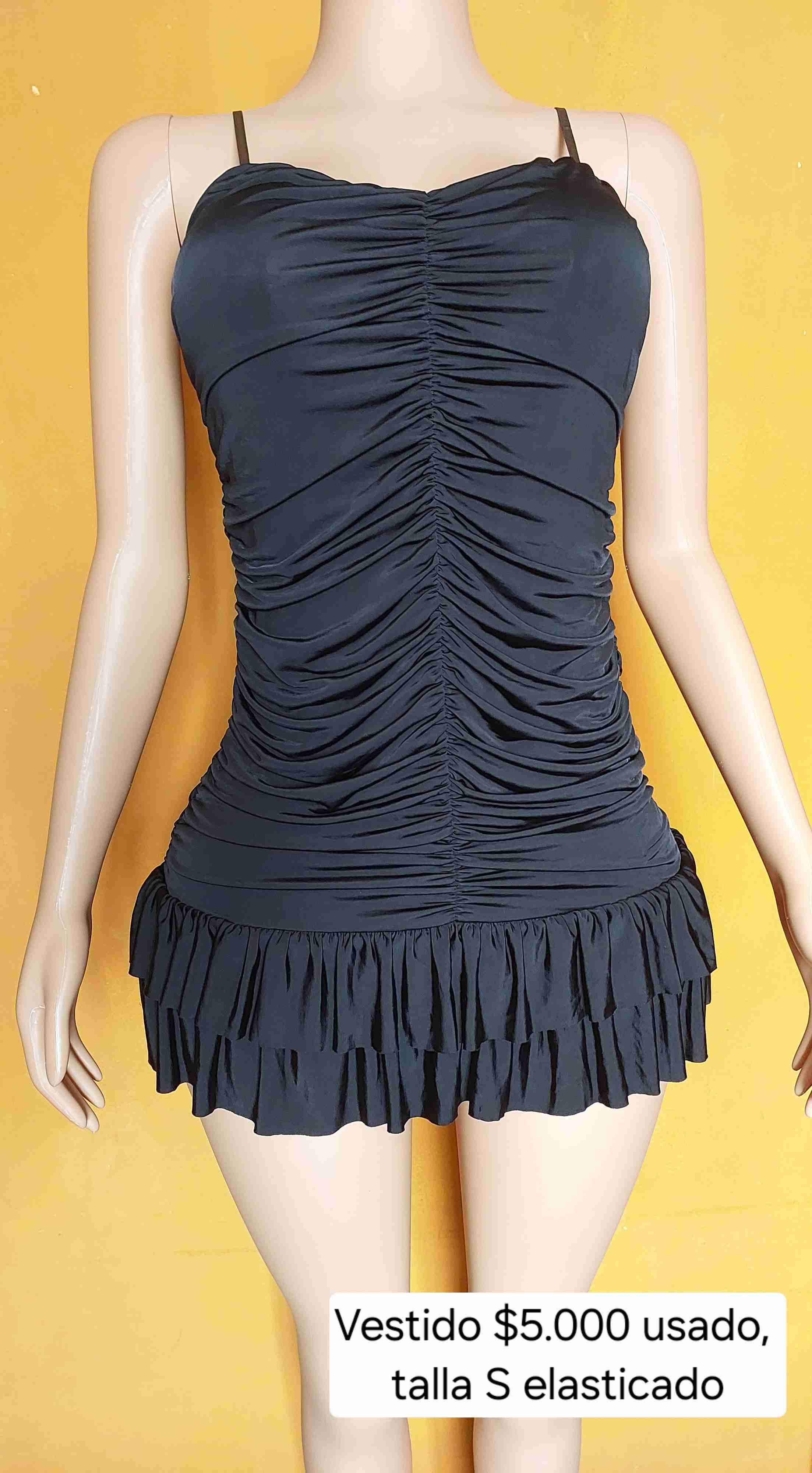 Vestido corto elasticado de color negro, con diseño fruncido y volantes. Talla S