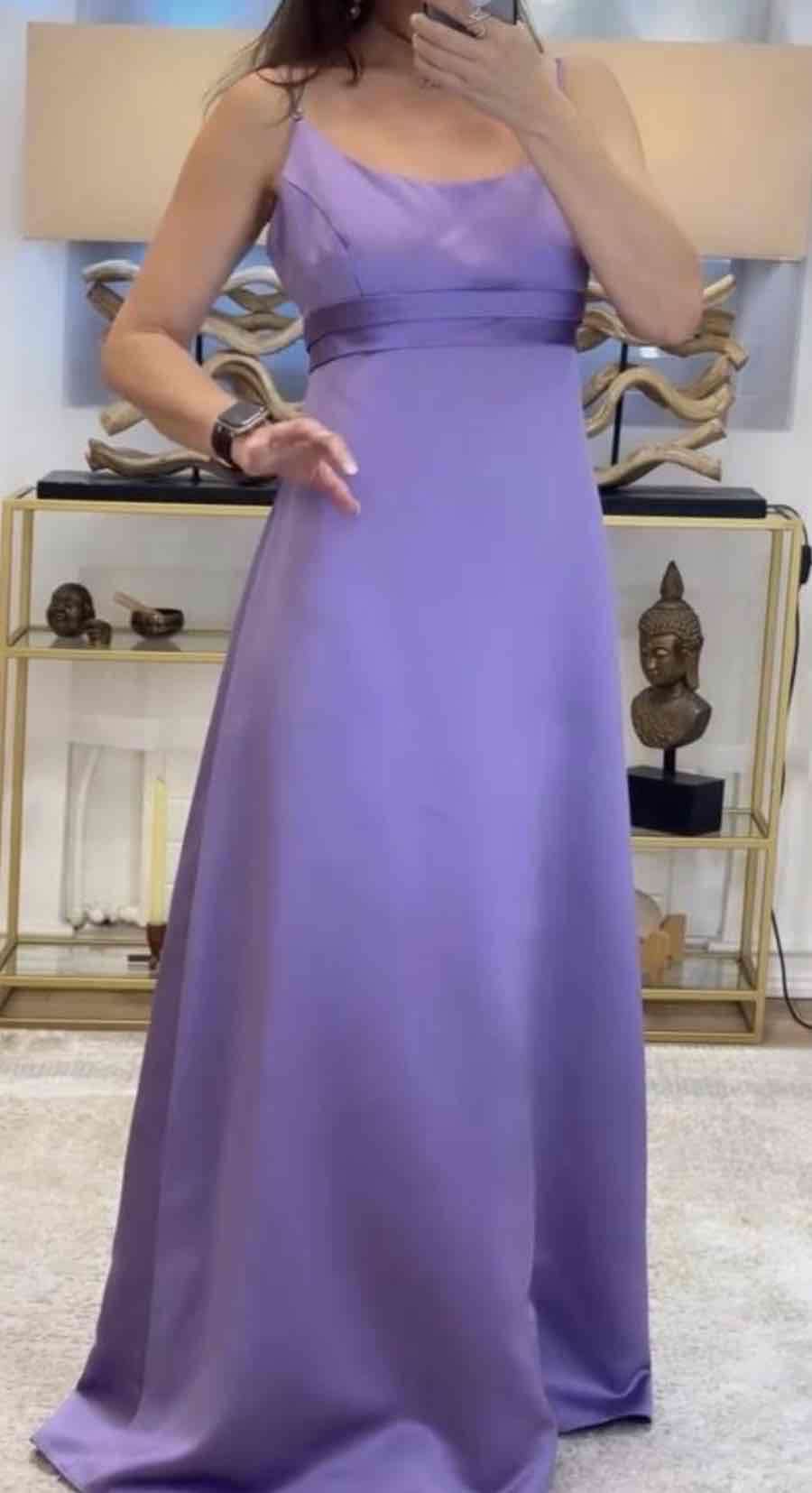 Elegante y clásico vestido de fiesta corte tipo imperio con tirantes finosy escote suave color lila satinado. Talla 42