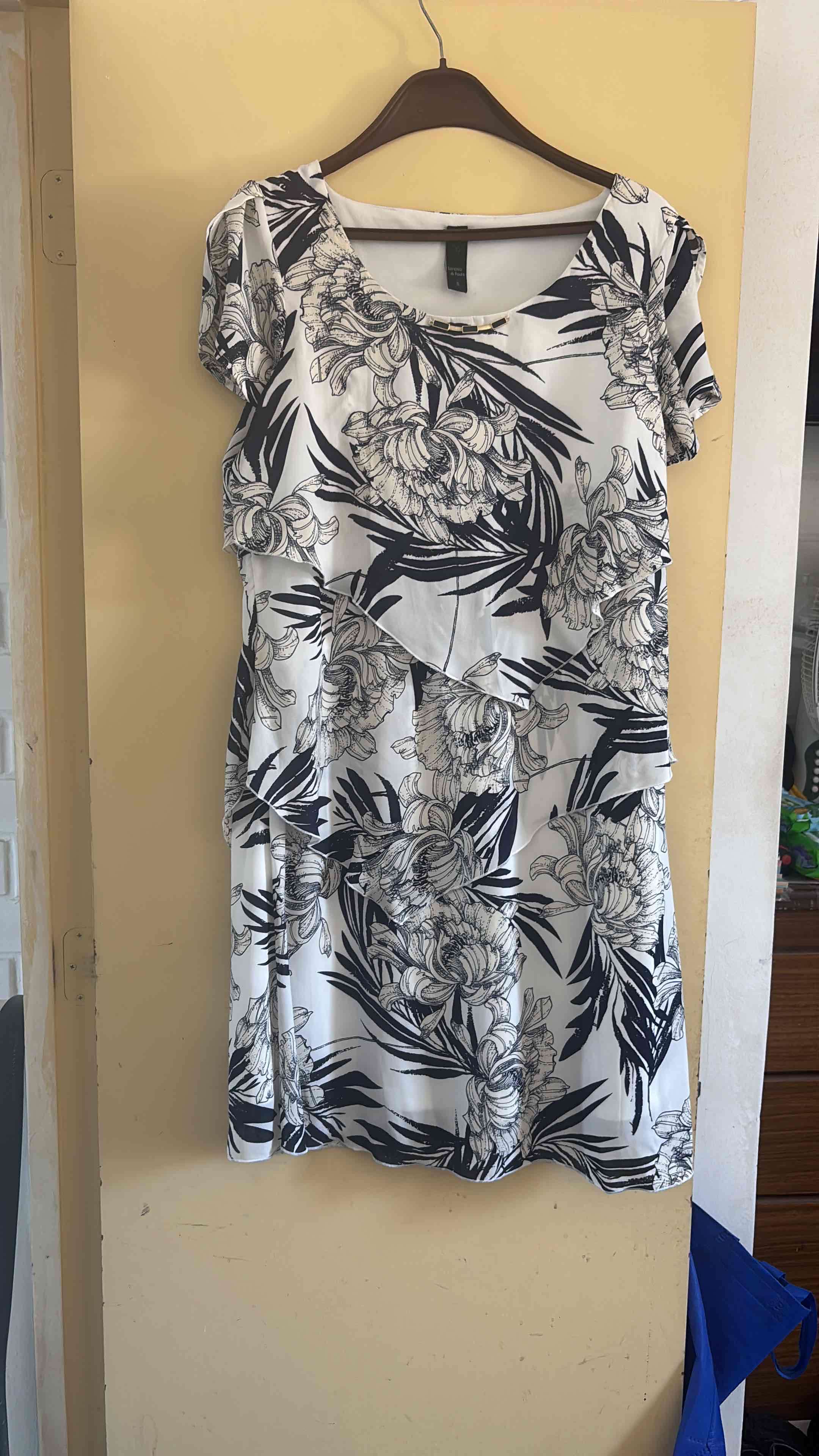 Vestido elegante con diseño floral en blanco y azul. Perfecto para eventos o casual. En buen estado general.