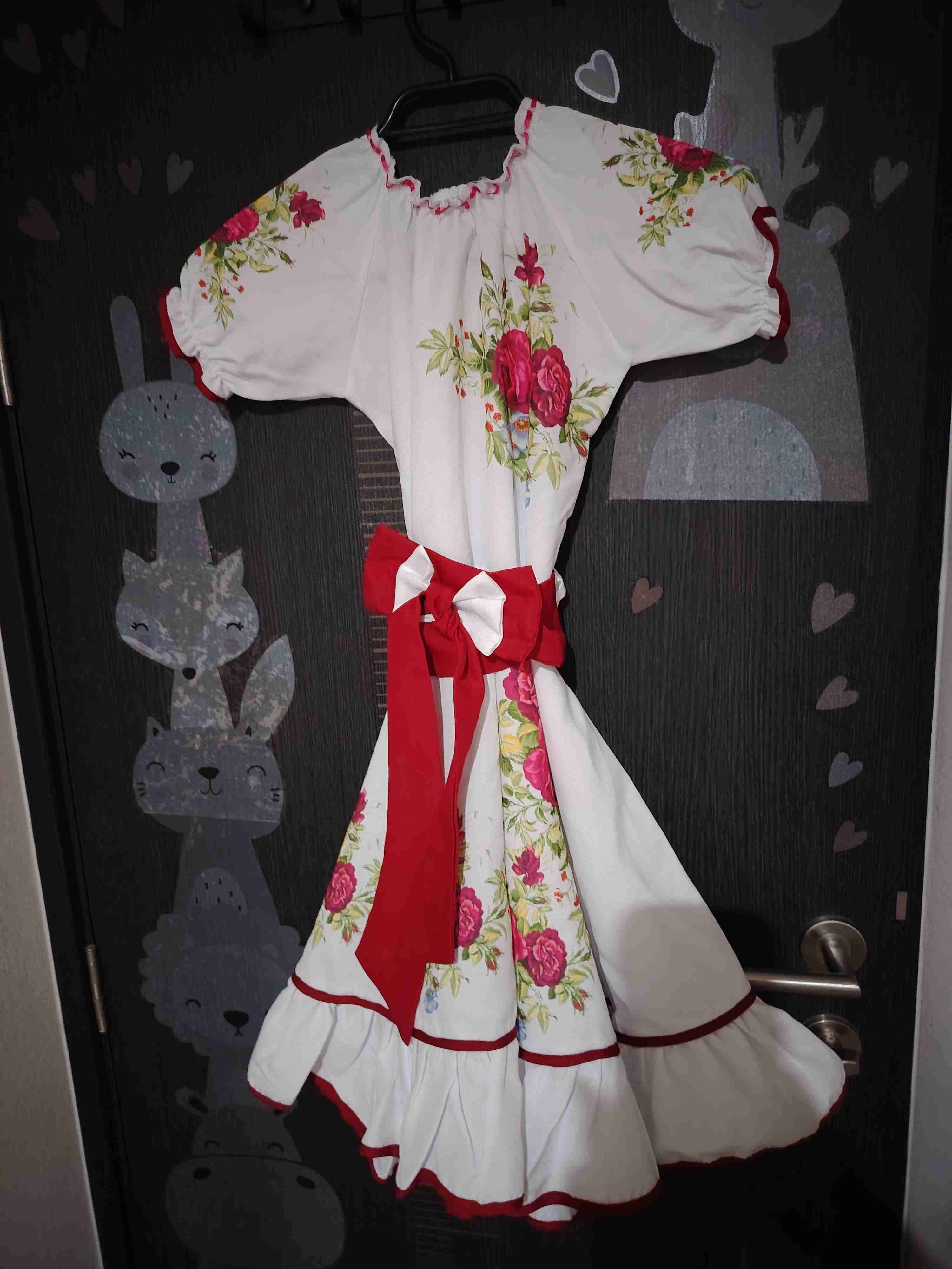Vestido floral en tonos blancos y rojos, estilo folclórico y elegante. Ideal para eventos especiales.Talla 4-6