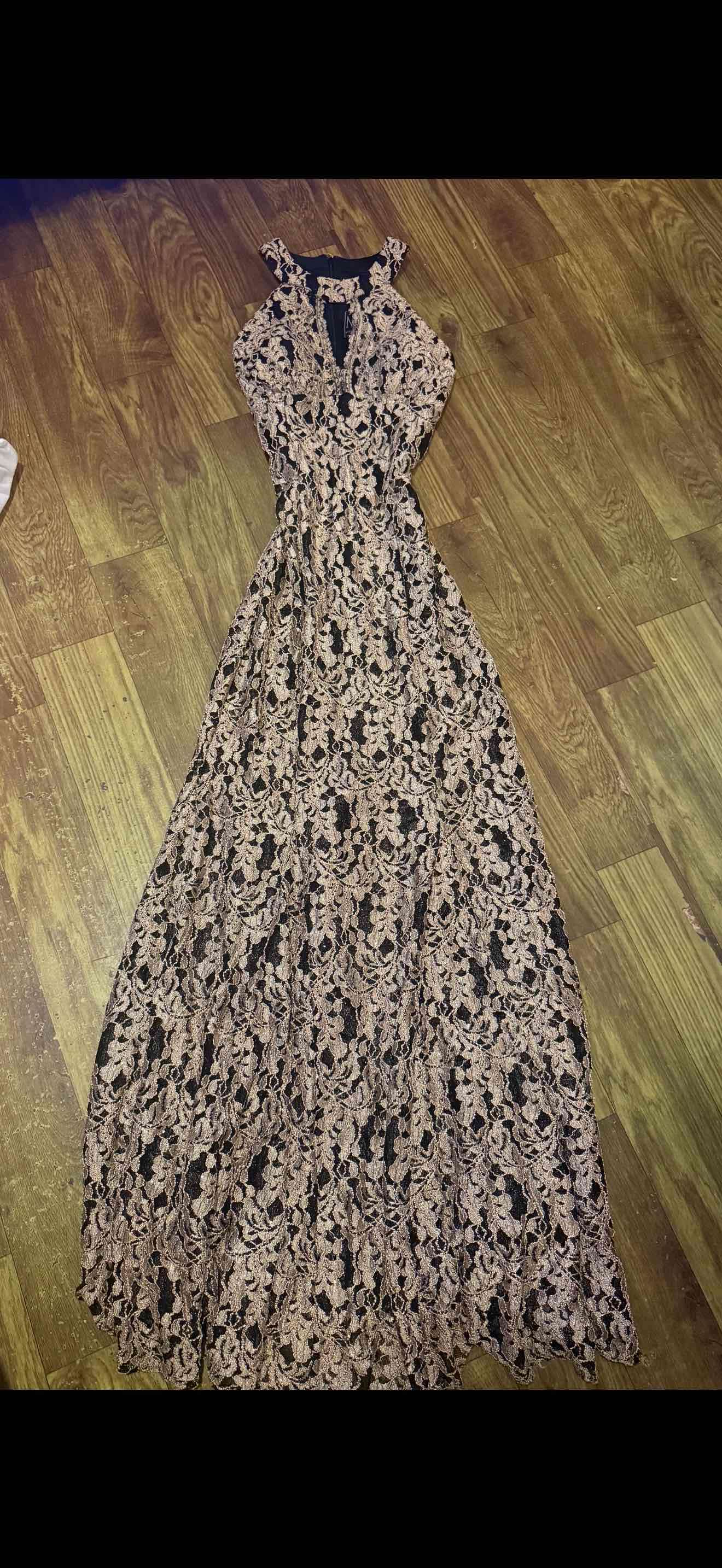 Elegante vestido largo de encaje negro con detalles florales. Ideal para eventos formales. En buen estado. Talla S-m