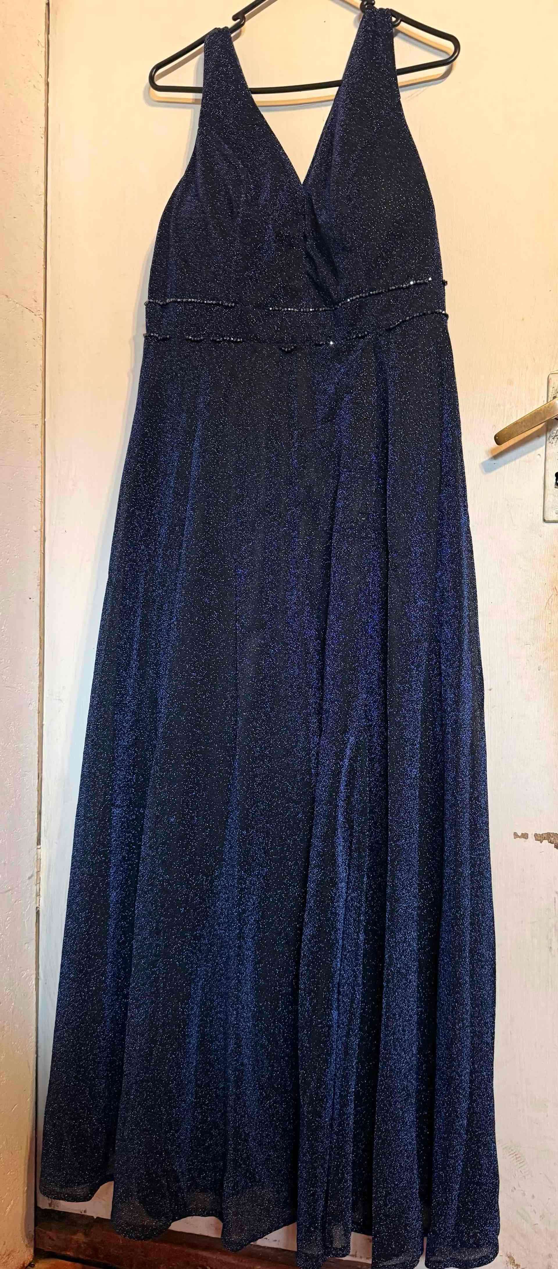 Vestido largo de fiesta en tono azul oscuro con brillo. Ideal para ocasiones especiales. Buen estado general. Detalle en perlas de la cintura. Abertura en pierna Adjunto fotos de cómo se ve puesto. Cierre invisible.
