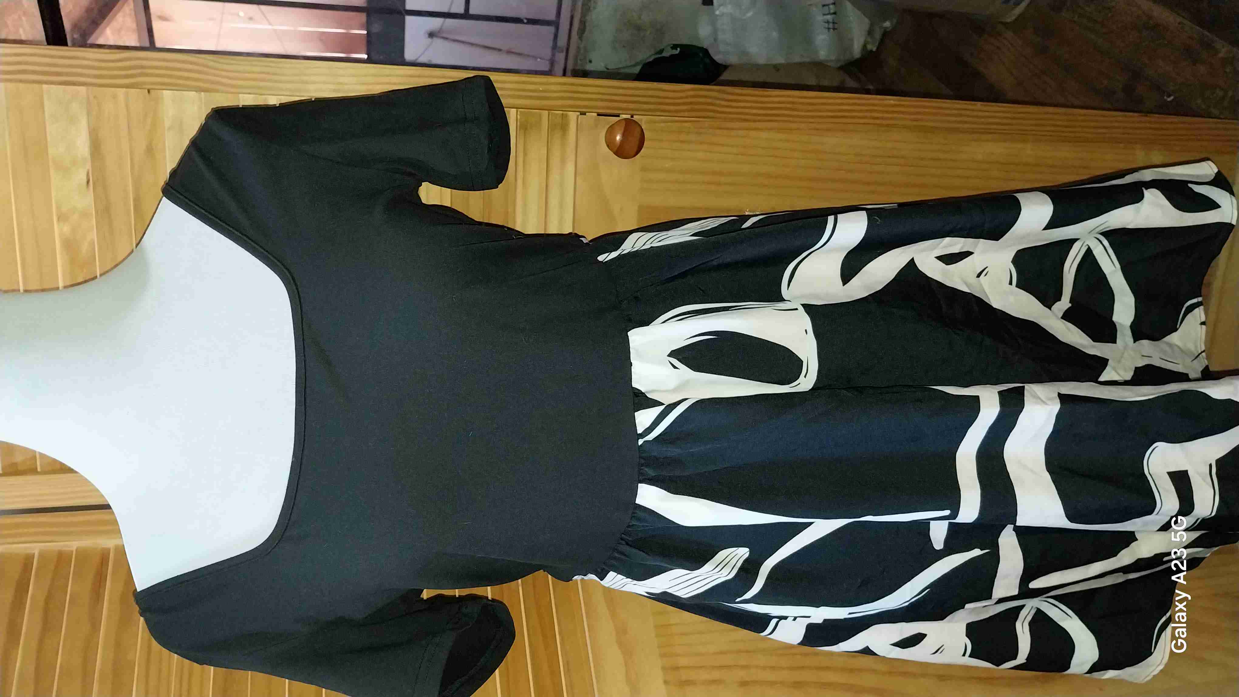 Vestido de algodón negro con estampado blanco abstracto. Ideal para ocasiones casuales. Buen estado general. Polea semi transparente.negra Polera manga larga azul metalizado brillante. Suéter color palo de rosa Buzó Adidas strech Tallas entre las m y L