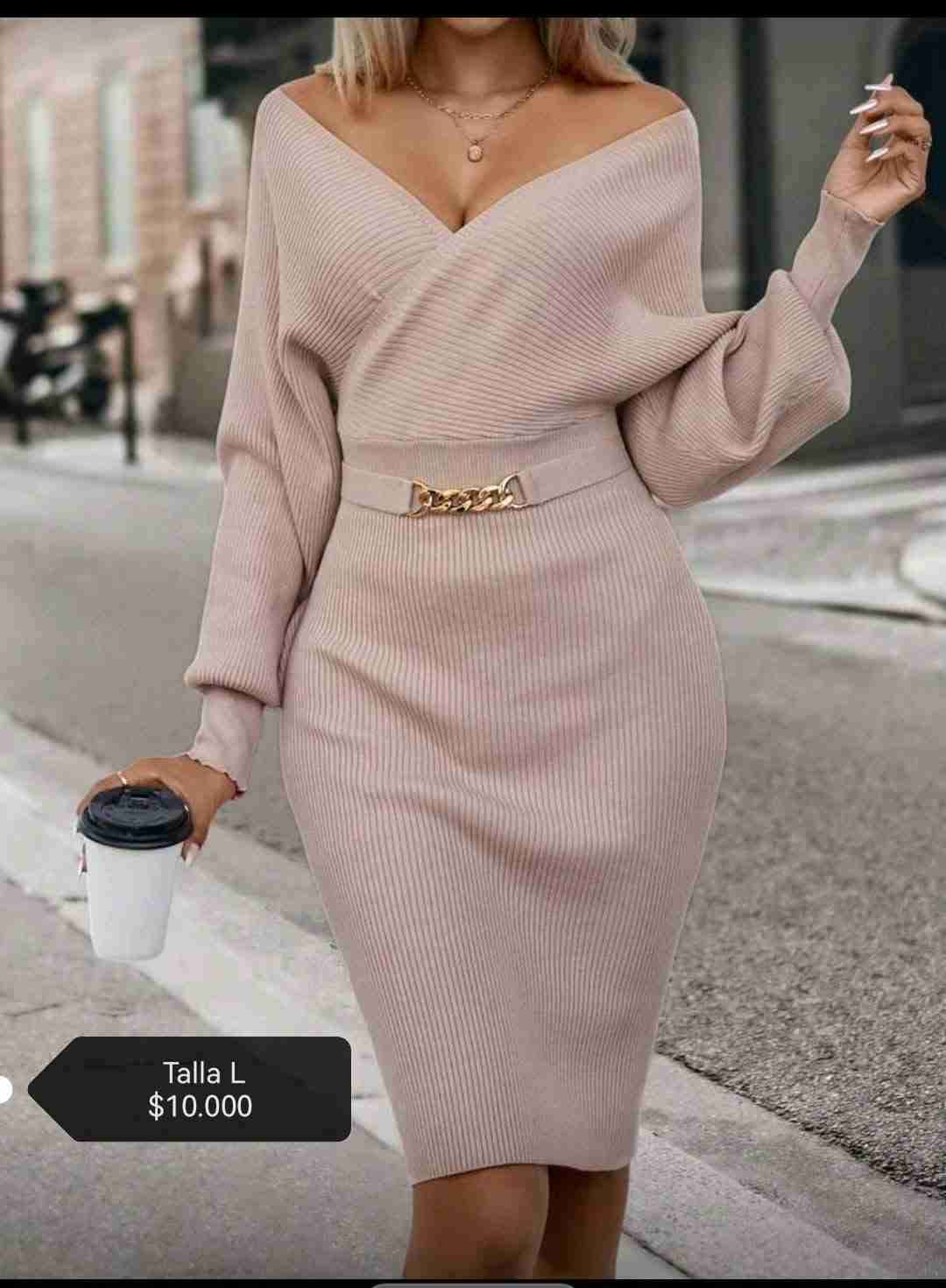 Elegante vestido Otoño - Invierno color rosa vieja de punto, ideal para ocasiones especiales. Viene con cinturón decorativo. Estado impecable.