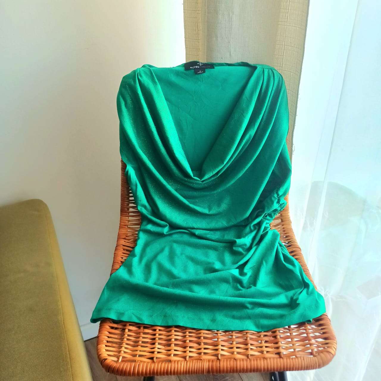 Polera verde con escote drapeado, con pequeños brillos, estilo elegante y suelto. Ideal para ocasiones especiales.